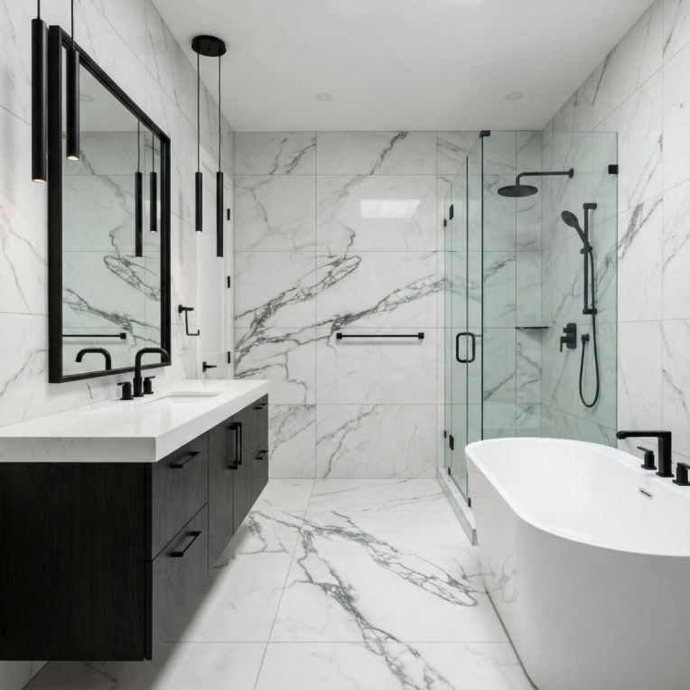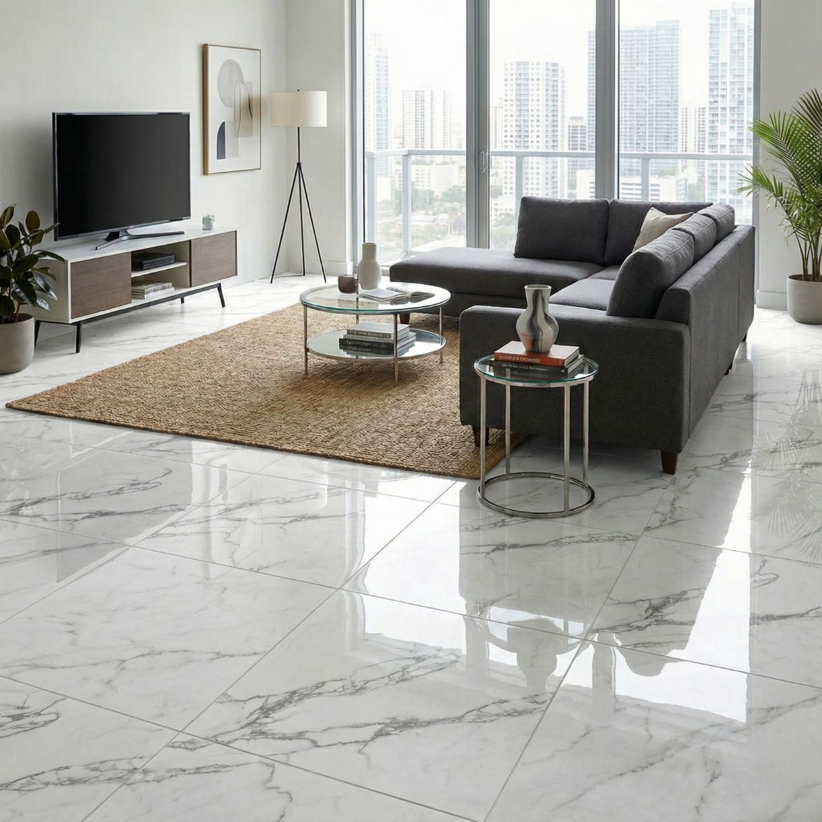 Artico Monochromatic White Marble Effect Rectified Gloss Porcelain Wall and Floor Tile offers the elegance of a marble effect tile in a finish that still feels practical to live with. Its marble effect detailing adds natural-looking variation across the soft white background, and the gloss finish shapes that movement in a way that feels polished rather than fussy. Practicality is where it earns its keep: the porcelain construction is durable and straightforward to look after, which matters in hard-working rooms. Rectified edges also help the finished installation look cleaner and more precise. Its 600x600mm proportions keep the layout balanced, which works well when you want clarity without the drama of an oversized slab. Use it in bathrooms, kitchens or open-plan rooms when you want one surface to tie different zones together without losing visual interest.