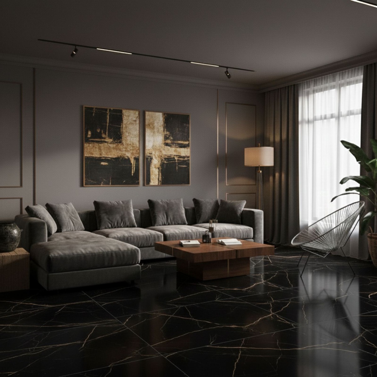 Atlantis And Gold Black Marble Effect Rectified Large Matt Porcelain Wall and Floor Tile offers the elegance of a marble effect tile in a finish that still feels practical to live with. The mix of deep black shading and marble-inspired patterning gives the tile a premium feel, and the matt finish stops it from looking one-dimensional. The porcelain body gives it the kind of dense, easy-care surface that works well in everyday spaces. Rectified edges also help the finished installation look cleaner and more precise. The matt surface keeps the overall result grounded and easier to style day to day. The 600x1200mm large format helps walls or floors read more cleanly, with fewer grout lines breaking up the surface. It is a strong fit for bathrooms, kitchens and connecting living spaces where using the same tile across walls and floors helps the scheme feel more unified.