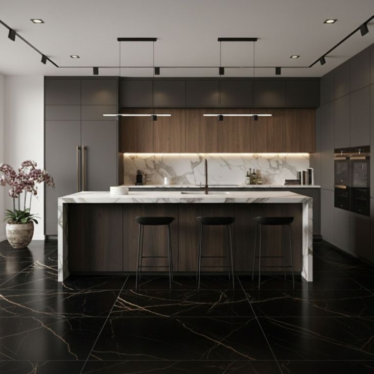 Pairing tip: Use plain off-white or pale grey supporting tiles, a lighter grout, and restrained brass or matte black accents so the veining stays centre stage.