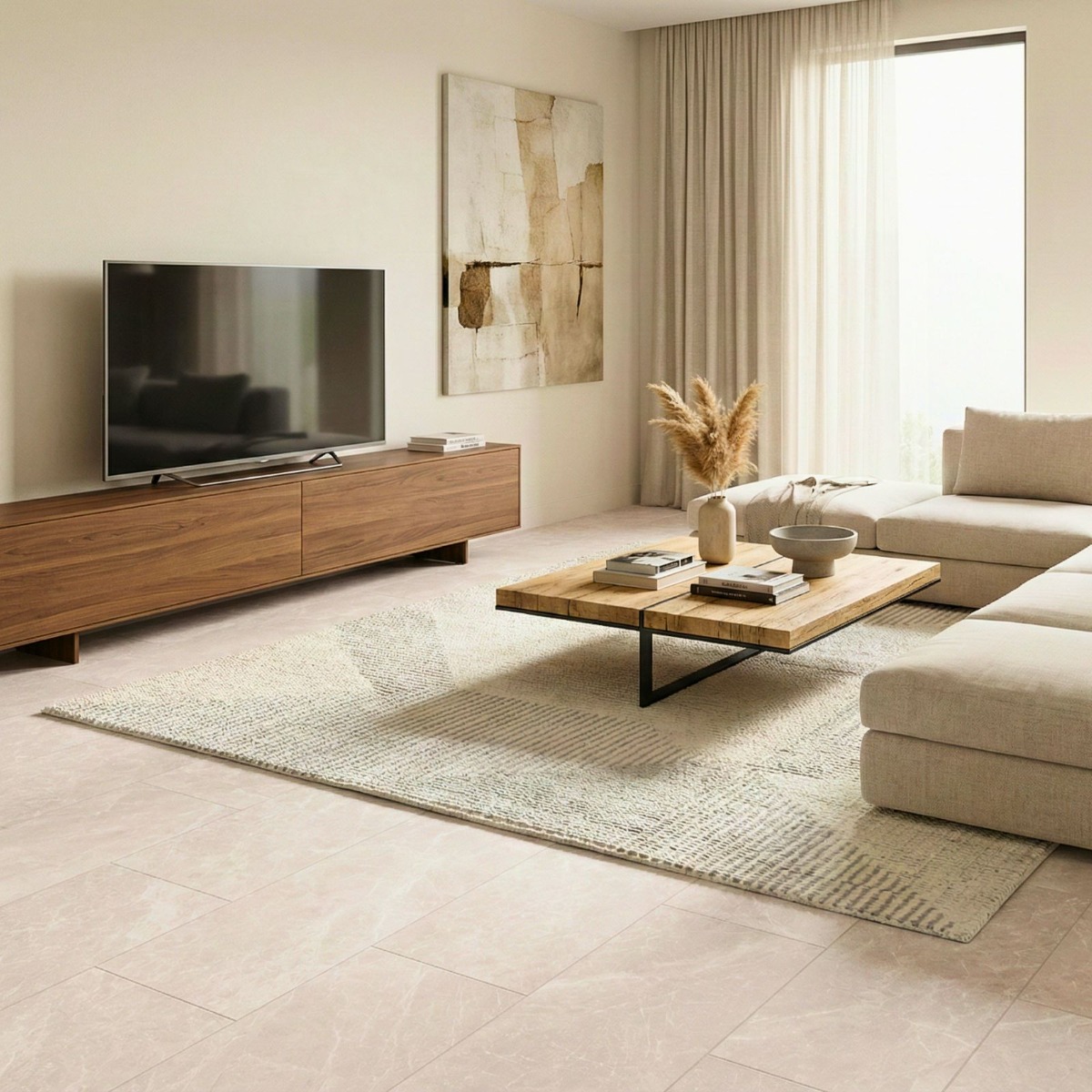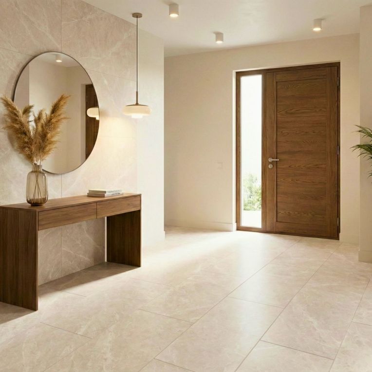 Capitolina Cream Concrete Effect Rectified Matt Porcelain Wall and Floor Tile is a strong choice when you want the simplicity of a concrete effect tile with a cleaner, more finished appearance. There is a stripped-back confidence to the soft cream concrete look, giving the room texture and depth without relying on strong pattern. The benefit of choosing porcelain here is that the surface stays robust and low-fuss in daily life, rather than looking good only on day one. Rectified edges also help the finished installation look cleaner and more precise. The matt surface keeps the overall result grounded and easier to style day to day. At 300x600mm, the tile is easy to use in tighter spaces and still large enough to keep the finished surface feeling fairly clean. Use it in bathrooms, kitchens or open-plan rooms when you want one surface to tie different zones together without losing visual interest.