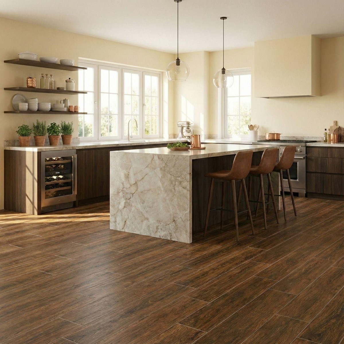 - Long plank format helps create a more continuous floor layout