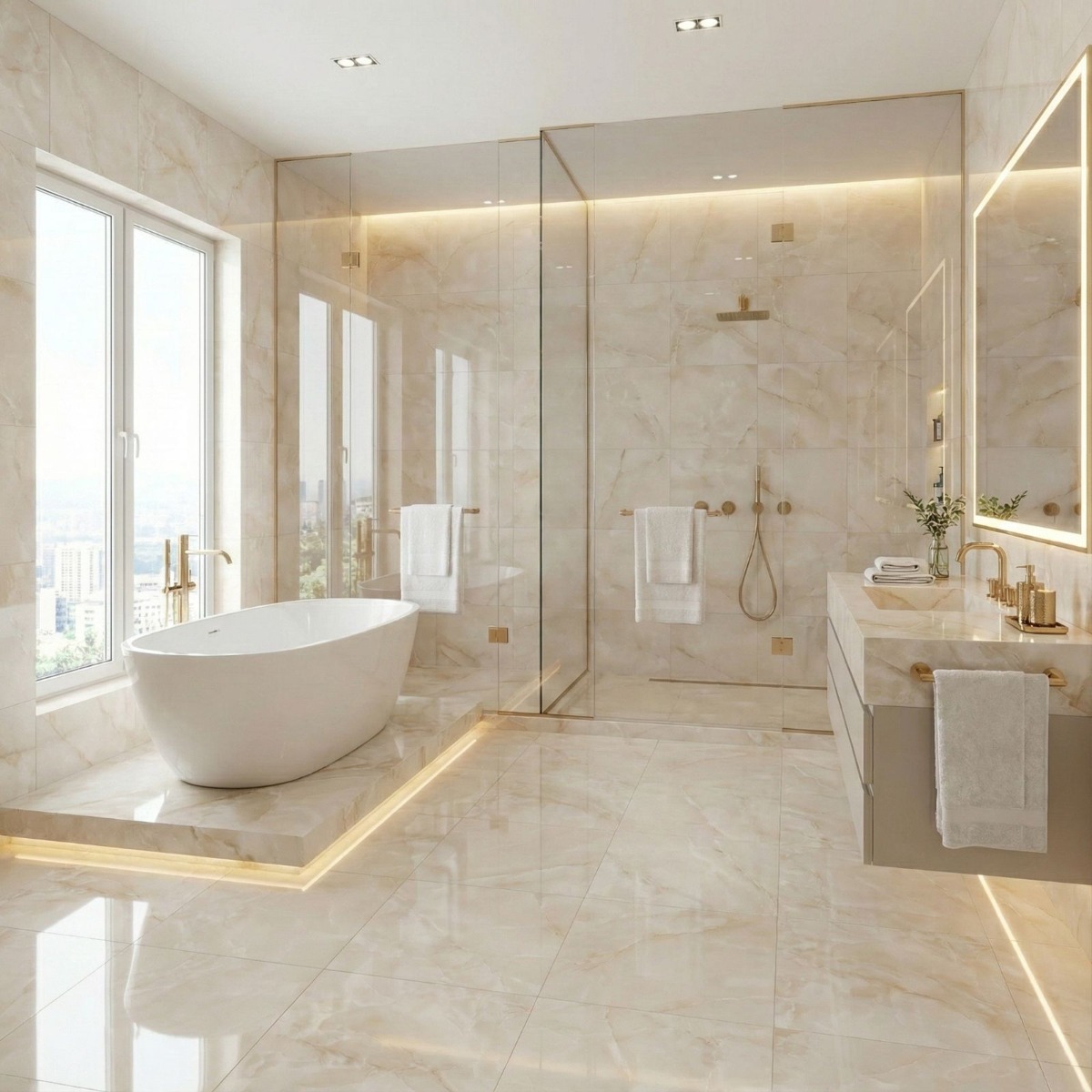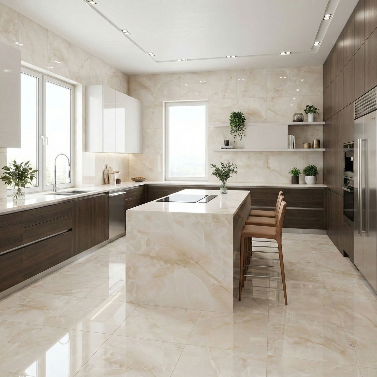 Cloudy Beige Onyx Effect Rectified Gloss Porcelain Wall and Floor Tile brings a more statement-led mood to the gloss porcelain wall and floor tile, echoing the layered character of an onyx effect tile. The warm beige onyx effect brings a more luxurious mood, using bold movement and tonal variation to make the surface feel alive. The benefit of choosing porcelain here is that the surface stays robust and low-fuss in daily life, rather than looking good only on day one. Rectified edges also help the finished installation look cleaner and more precise. The 600x600mm square format creates a tidy, even grid that feels modern without becoming stark. It makes sense in hard-working interiors where walls and floors need to speak the same design language, especially in bathrooms and kitchens.