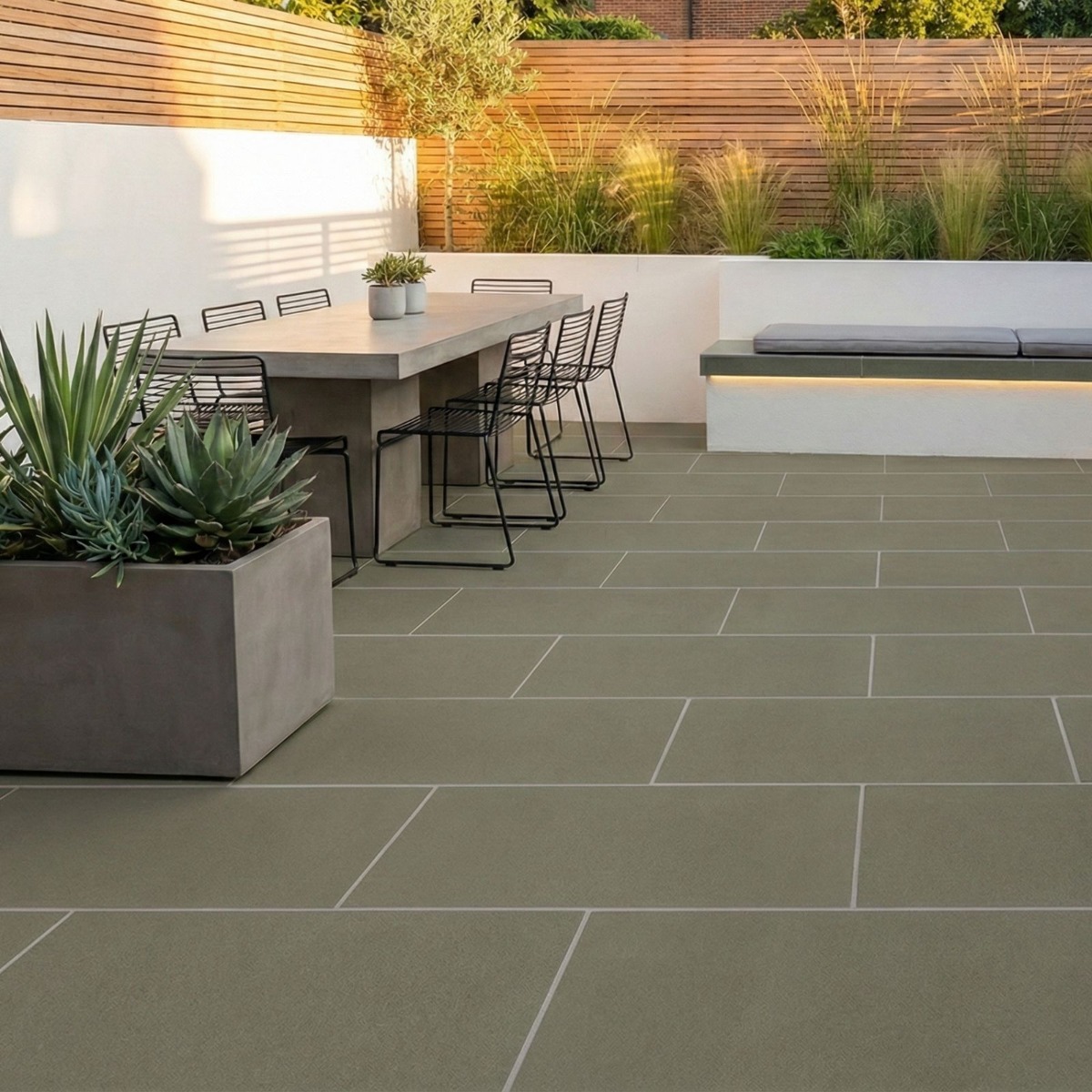 Core Stone Green Concrete Effect Matt Porcelain Outdoor Paver takes the everyday porcelain outdoor paver and gives it the understated edge of a concrete effect tile. The concrete effect treatment gives the stone-green surface an urban, design-led feel that still reads warm enough for residential spaces. It is not just about looks: the porcelain build is well suited to outdoor wear, so the tile keeps its cleaner finish without demanding constant upkeep. Rectified edges also help the paving look neater once installed. The 600x900mm format lands in a useful middle ground, helping surfaces look broader while keeping the installation feeling proportionate. It works well in outdoor living areas where the surface needs to look considered without becoming delicate or fussy.