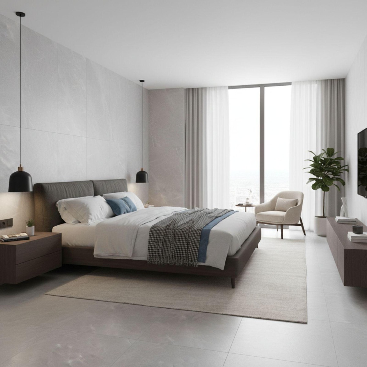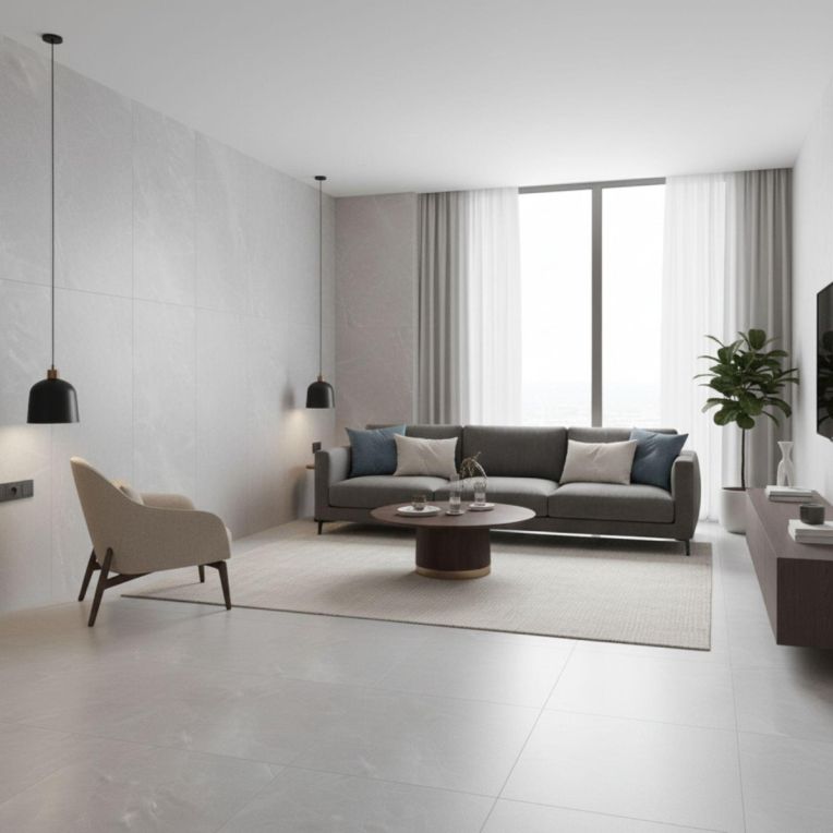 Crystal Grey Concrete Effect Rectified Matt Porcelain Wall and Floor Tile is a strong choice when you want the simplicity of a concrete effect tile with a cleaner, more finished appearance. The smoky grey colouring and concrete effect surface create a clean architectural look that works well with timber, metal and simple joinery. The porcelain body gives it the kind of dense, easy-care surface that works well in everyday spaces. Rectified edges also help the finished installation look cleaner and more precise. The matt surface keeps the overall result grounded and easier to style day to day. Because it comes in 600x1200mm, the layout feels broader and calmer, which is especially useful when you want a more seamless finish. It is a strong fit for bathrooms, kitchens and connecting living spaces where using the same tile across walls and floors helps the scheme feel more unified.