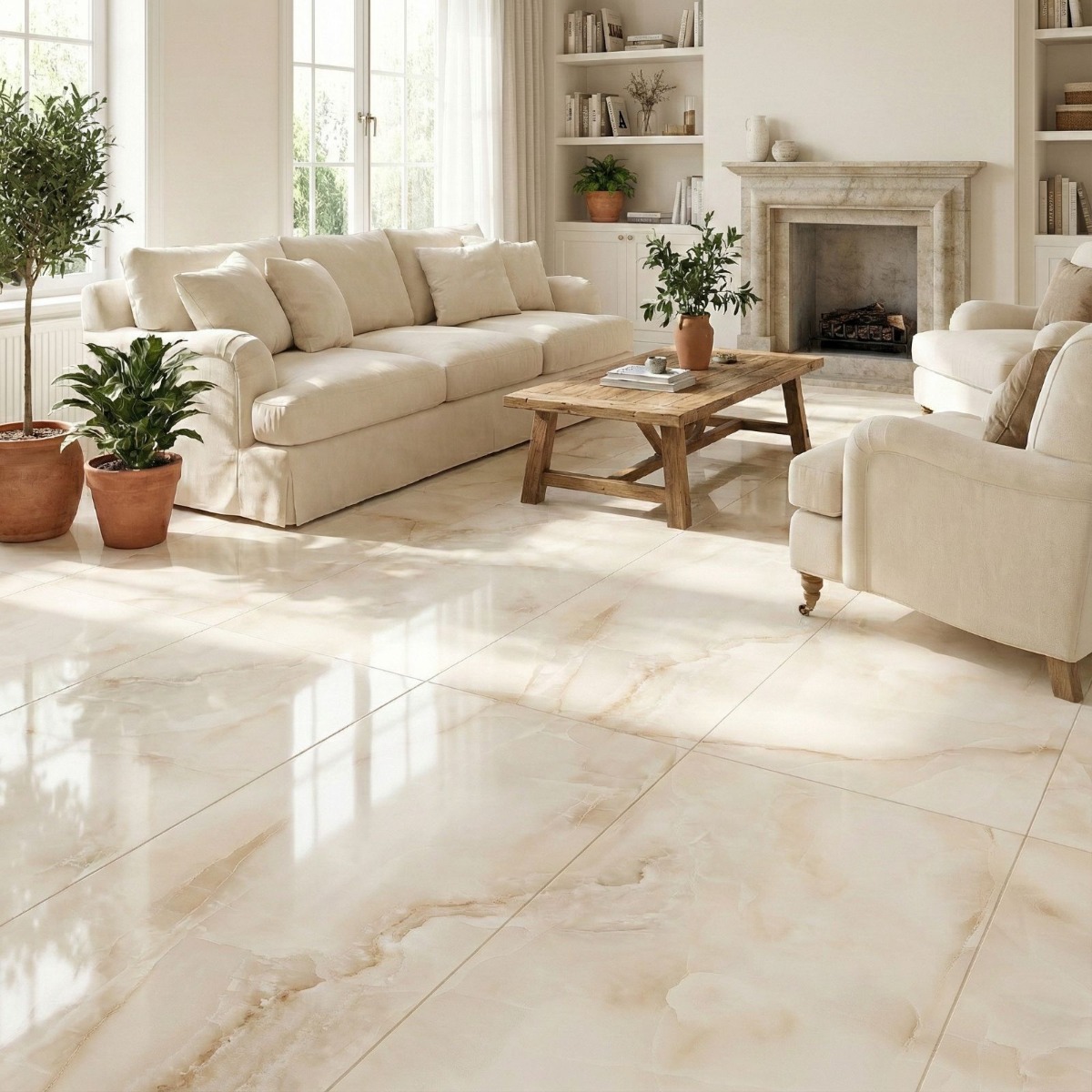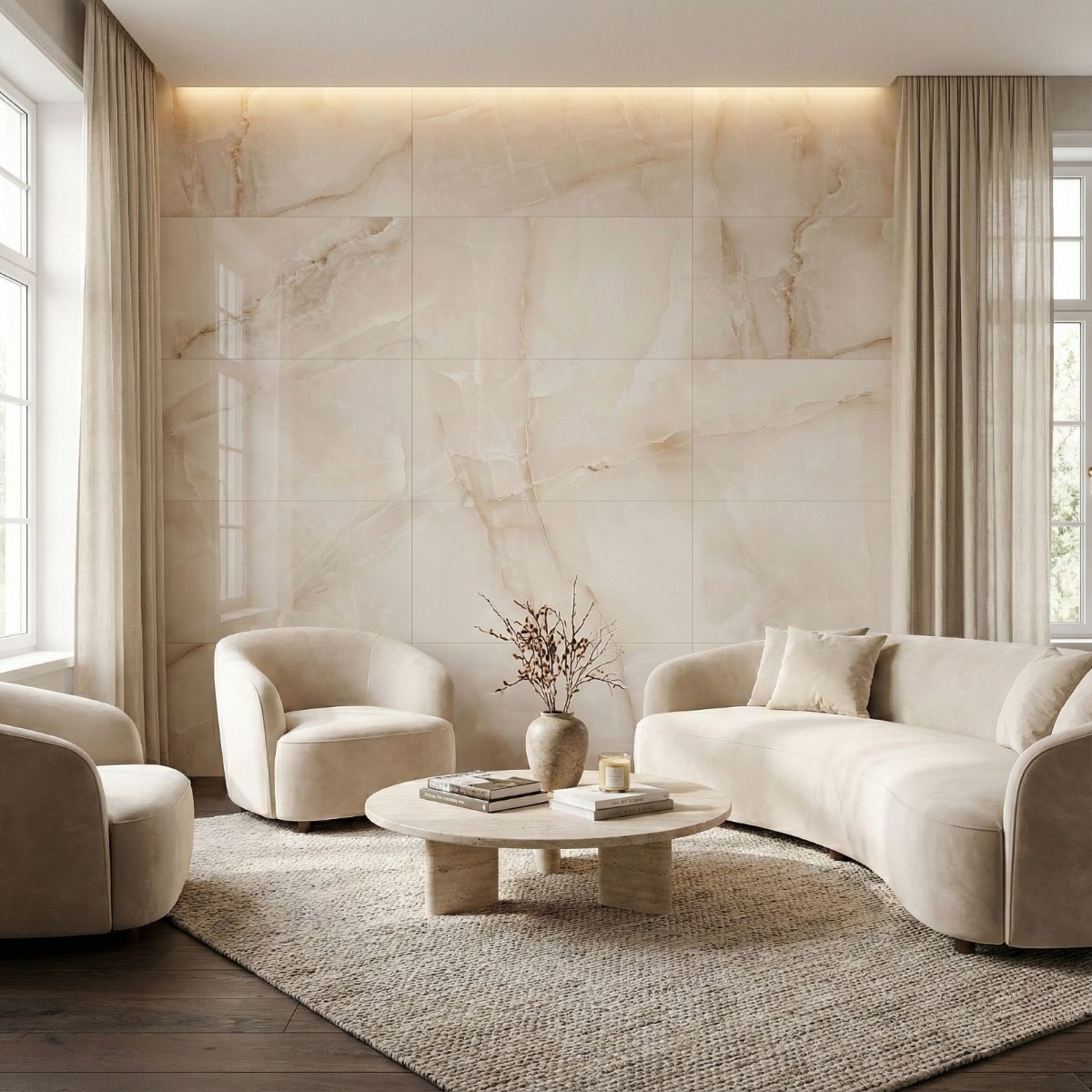 Dream Brown Onyx Effect Rectified Large Gloss Porcelain Wall and Floor Tile introduces the drama of an onyx effect tile in a way that still feels controlled and usable. You get the richer, more decorative character of an onyx effect tile here, with layered earth-brown shading that adds clear visual depth. The porcelain body gives it the kind of dense, easy-care surface that works well in everyday spaces. Rectified edges also help the finished installation look cleaner and more precise. The 600x1200mm large format helps walls or floors read more cleanly, with fewer grout lines breaking up the surface. It is a strong fit for bathrooms, kitchens and connecting living spaces where using the same tile across walls and floors helps the scheme feel more unified.