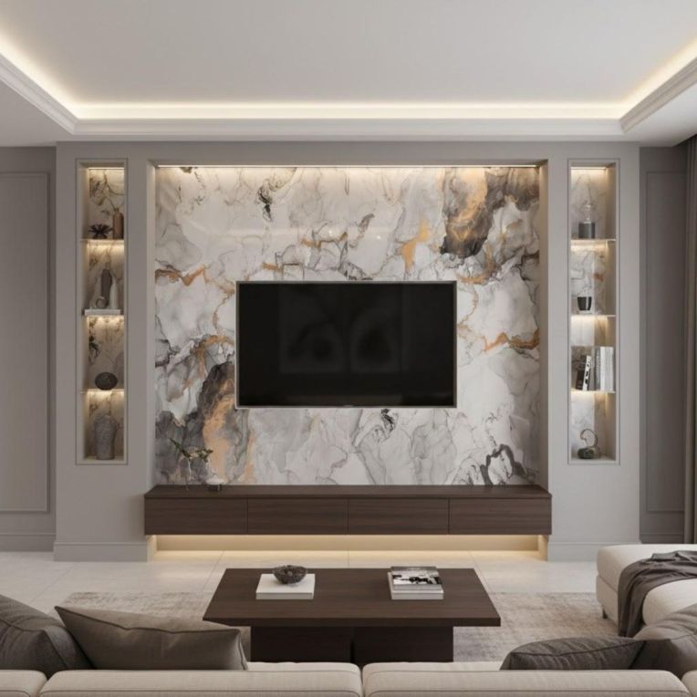 Pairing tip: Keep the surrounding finishes understated with plain neutrals, soft metallic accents and very little extra pattern so the onyx movement holds the attention.