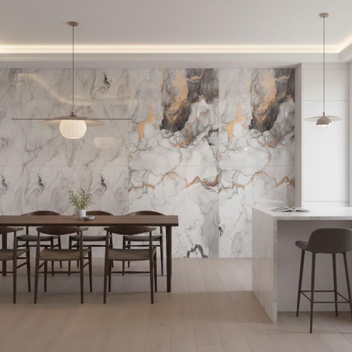 Fluid Gold Wall And Floor Statement White Onyx Effect Rectified High Gloss Porcelain Wall and Floor Tile gives the high gloss porcelain wall and floor tile a richer, more expressive look thanks to its onyx effect tile styling. You get the richer, more decorative character of an onyx effect tile here, with layered clean white shading that adds clear visual depth. As a porcelain tile it is built for regular use, so you get a finish that looks design-led without becoming awkward to maintain. Rectified edges also help the finished installation look cleaner and more precise. The scale of the 600x1200mm format gives the room a more open read and reduces visual interruption across larger runs. It is a strong fit for bathrooms, kitchens and connecting living spaces where using the same tile across walls and floors helps the scheme feel more unified.