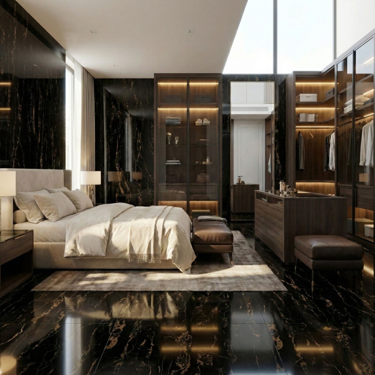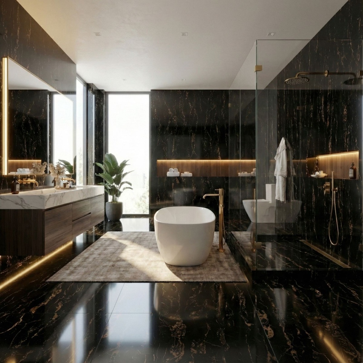 Pairing tip: Balance the darker marble look with soft white walls, light grout and a few warm metallic details so the finish still feels open.