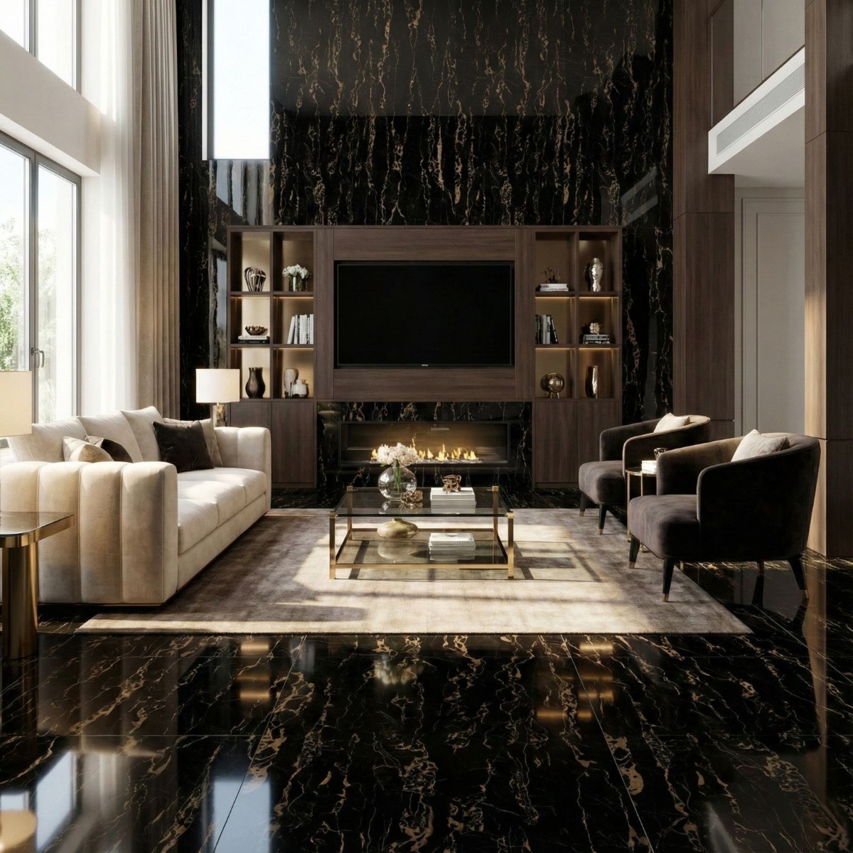 Golden Portoro Black Marble Effect Rectified High Gloss Porcelain Wall and Floor Tile is an easy way to bring in the look of a marble effect tile without tipping the room into something overly formal. The mix of charcoal-black shading and marble-inspired patterning gives the tile a premium feel, and the high gloss finish stops it from looking one-dimensional. The porcelain body gives it the kind of dense, easy-care surface that works well in everyday spaces. Rectified edges also help the finished installation look cleaner and more precise. The reflective finish is also useful where you want to bounce a bit more light around the room. In 600x1200mm, the tile has enough scale to make smaller rooms feel less chopped up and larger rooms feel more resolved. It is a strong fit for bathrooms, kitchens and connecting living spaces where using the same tile across walls and floors helps the scheme feel more unified.