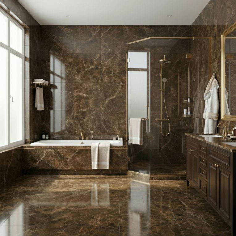 Great Emperdor Brown Marble Effect Rectified High Gloss Porcelain Wall and Floor Tile offers the elegance of a marble effect tile in a finish that still feels practical to live with. You get the familiar depth of a marble effect tile here, with earth-brown tones and subtle veining that make the surface feel layered and refined. The benefit of choosing porcelain here is that the surface stays robust and low-fuss in daily life, rather than looking good only on day one. Rectified edges also help the finished installation look cleaner and more precise. The reflective finish is also useful where you want to bounce a bit more light around the room. The square 600x600mm size sits comfortably in both compact and medium rooms, giving a neat finish that does not feel fussy. It is a strong fit for bathrooms, kitchens and connecting living spaces where using the same tile across walls and floors helps the scheme feel more unified.