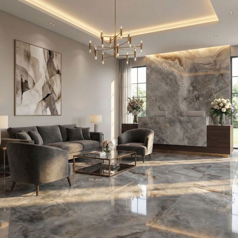 Gun Smoke Grande Earthy Grey Onyx Effect Rectified Gloss Porcelain Wall and Floor Tile brings a more statement-led mood to the gloss porcelain wall and floor tile, echoing the layered character of an onyx effect tile. The onyx-inspired movement runs through the smoky grey tones in a way that feels fluid and expressive, especially across larger expanses. As a porcelain tile it is built for regular use, so you get a finish that looks design-led without becoming awkward to maintain. Rectified edges also help the finished installation look cleaner and more precise. The scale of the 600x1200mm format gives the room a more open read and reduces visual interruption across larger runs. Use it in bathrooms, kitchens or open-plan rooms when you want one surface to tie different zones together without losing visual interest.