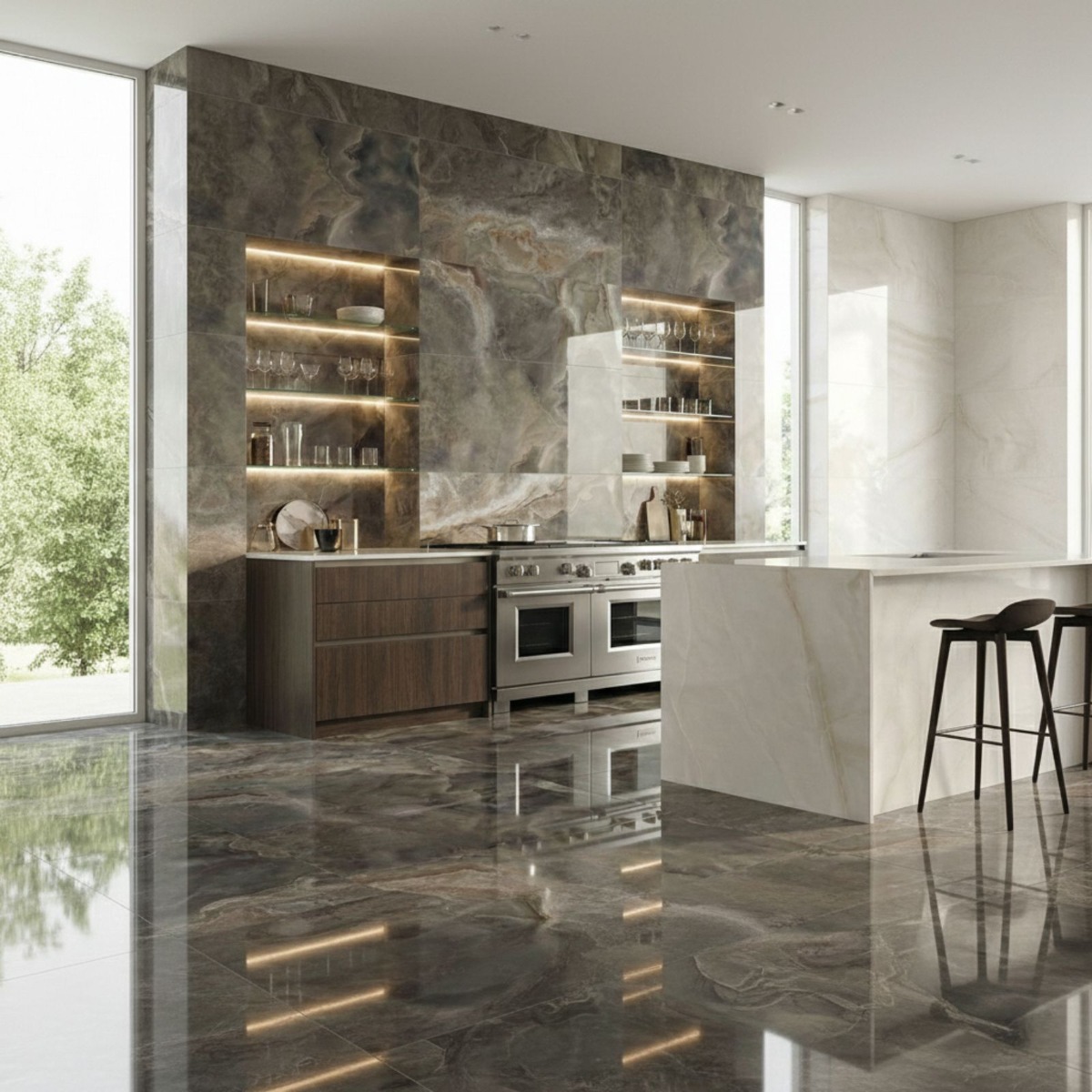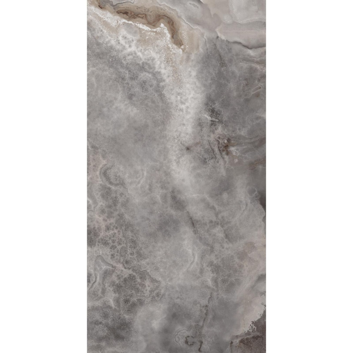 Gun Smoke Grande Earthy Grey Onyx Effect Rectified Gloss Porcelain Wall and Floor Tile