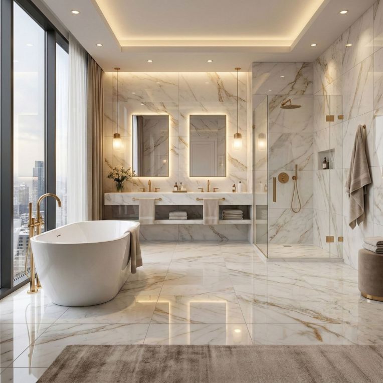 - Marble-inspired design that gives the tile a refined stone look