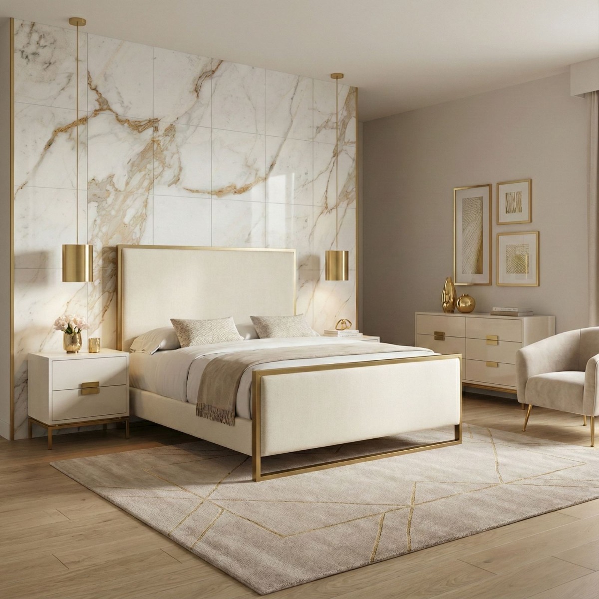 Pairing tip: Keep surrounding finishes soft and plain with warm neutrals, natural oak or gentle greys so the marble movement does the work.