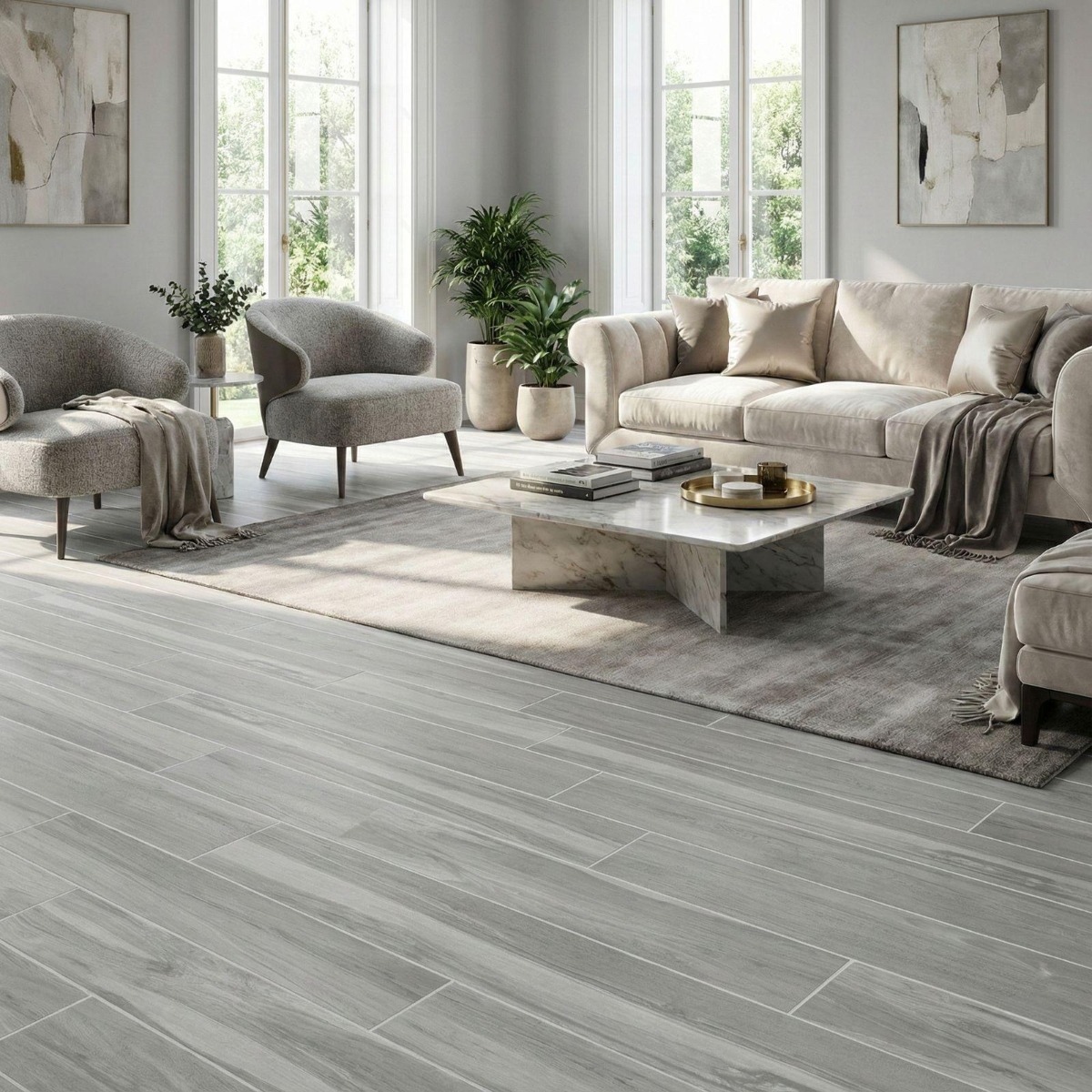 Icy Grey Wooden Effect Matt Porcelain Wall and Floor Tile takes the matt porcelain wall and floor tile in a warmer direction, drawing on the familiar appeal of a wood effect tile. The wood effect design uses grey tones and directional grain detail to bring warmth and a more relaxed visual texture into the space. As a porcelain tile it is built for regular use, so you get a finish that looks design-led without becoming awkward to maintain. The 200x1200mm format works well when you want to stretch sightlines and avoid the choppier look that shorter modules can create. Use it where the room needs a harder-wearing surface but you do not want the result to feel flat or utilitarian.