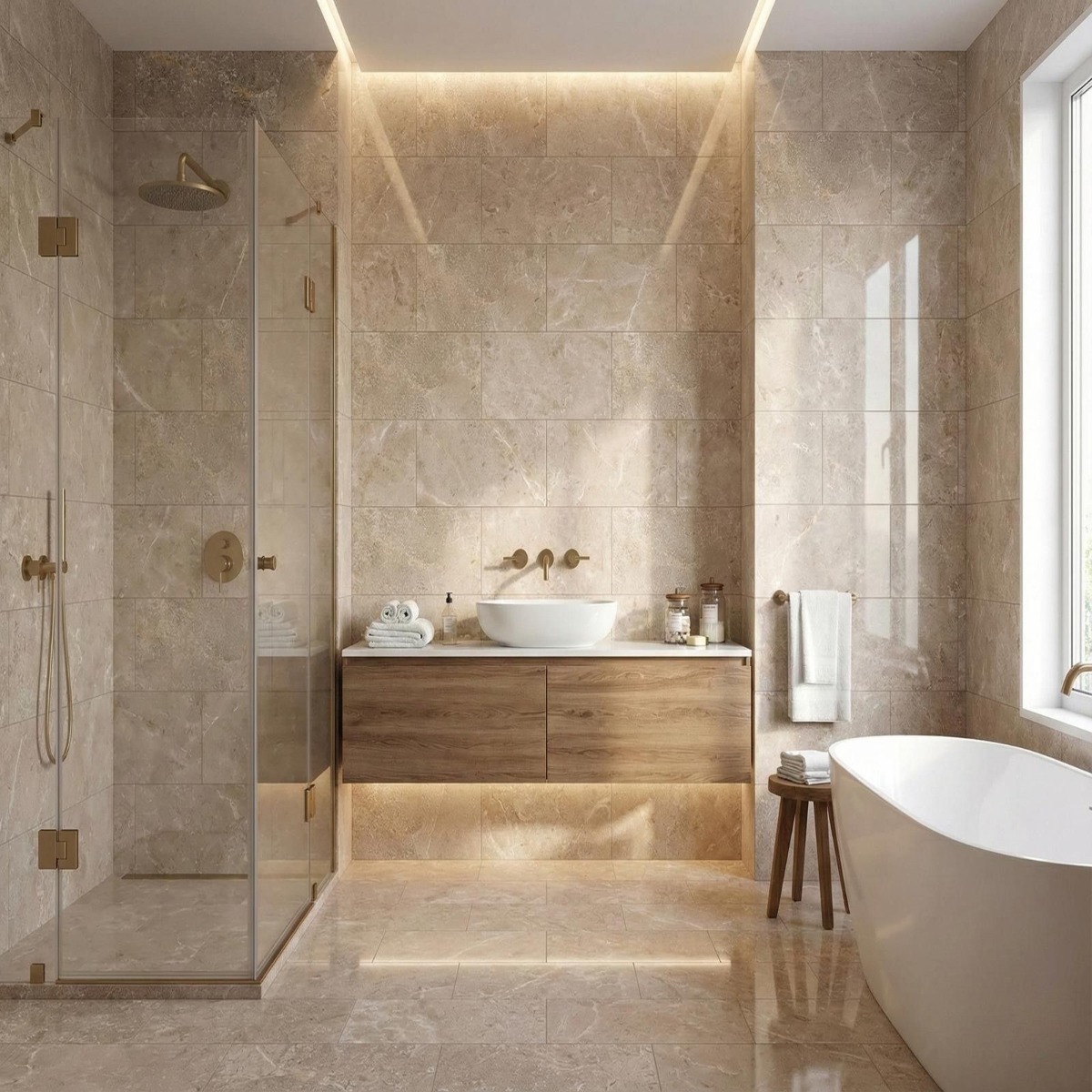 Jerico Brown Concrete Effect Rectified Gloss Porcelain Wall and Floor Tile brings a sharper, more design-led take to the gloss porcelain wall and floor tile, with the pared-back attitude of a concrete effect tile. The concrete effect treatment gives the walnut-toned surface an urban, design-led feel that still reads warm enough for residential spaces. The benefit of choosing porcelain here is that the surface stays robust and low-fuss in daily life, rather than looking good only on day one. Rectified edges also help the finished installation look cleaner and more precise. At 300x600mm, the tile is easy to use in tighter spaces and still large enough to keep the finished surface feeling fairly clean. It makes sense in hard-working interiors where walls and floors need to speak the same design language, especially in bathrooms and kitchens.