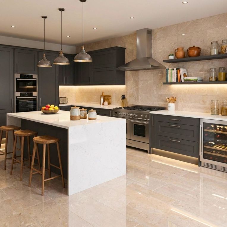 Pairing tip: Keep the surrounding palette simple with white, timber and black accents so the concrete effect can do its job without looking severe.