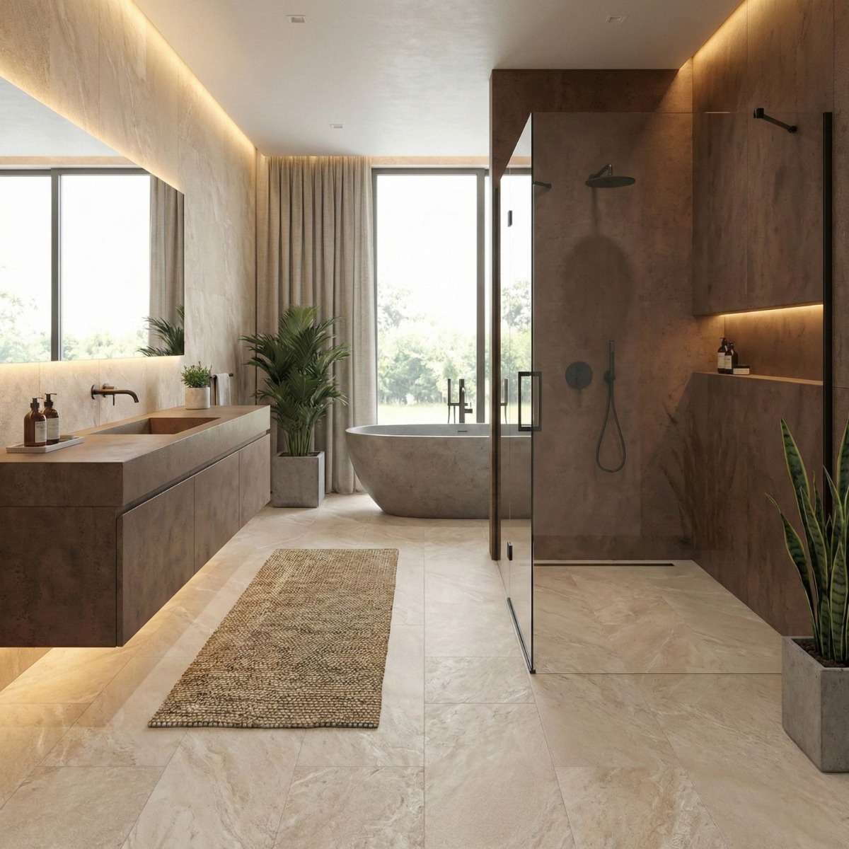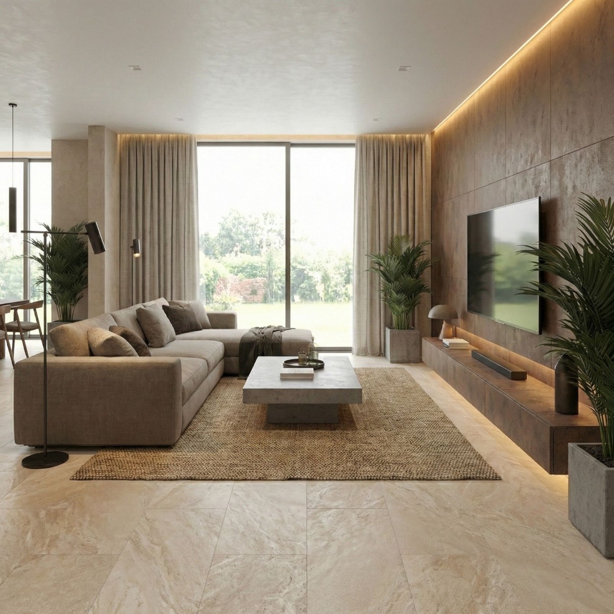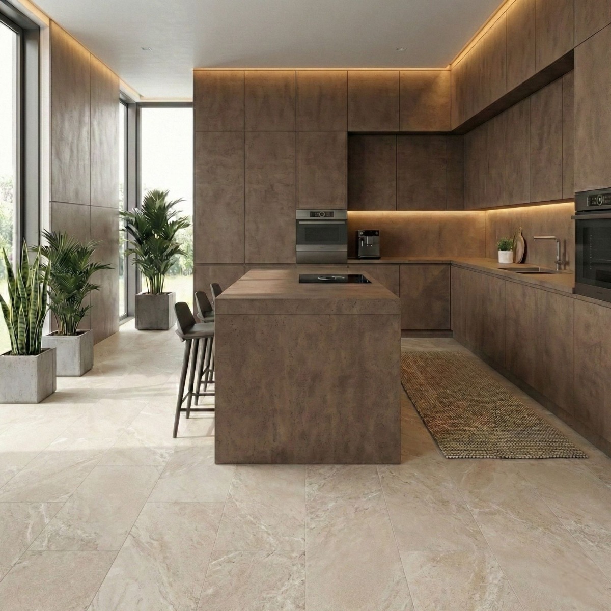 Pairing tip: Pair it with off-whites, taupe textiles and natural wood to give the concrete effect a warmer, more residential finish.