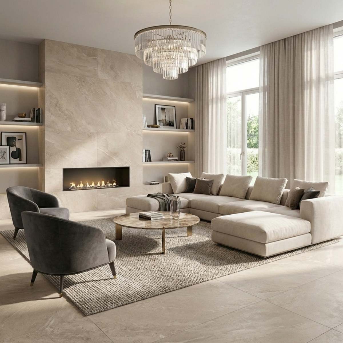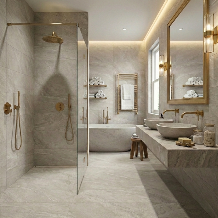 - Large format tile reduces visible grout lines for a cleaner finish