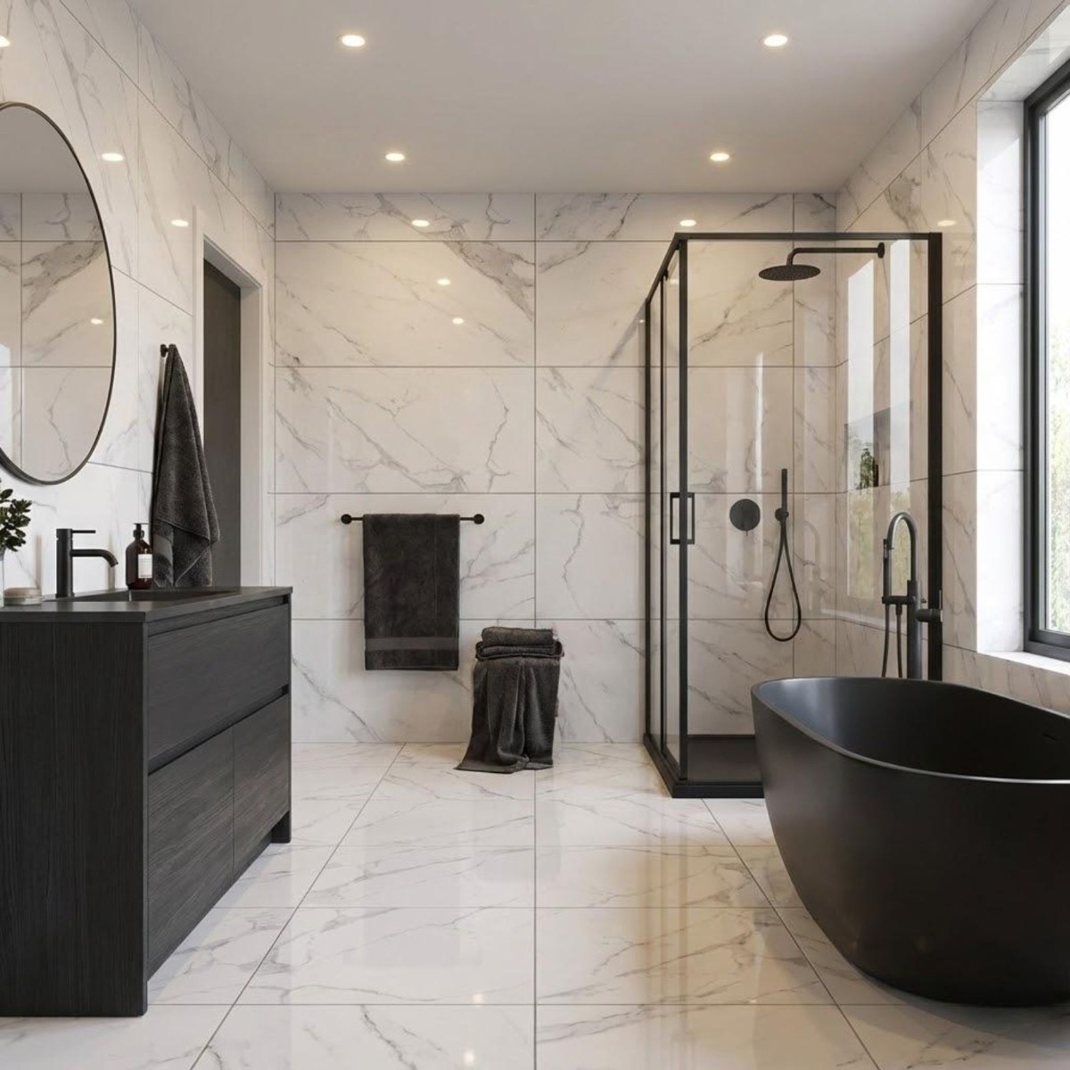 - Porcelain material offers a strong mix of style and low maintenance