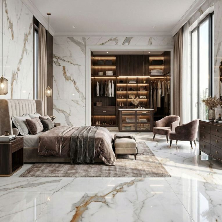 Pairing tip: Keep surrounding finishes soft and plain with warm neutrals, natural oak or gentle greys so the marble movement does the work.