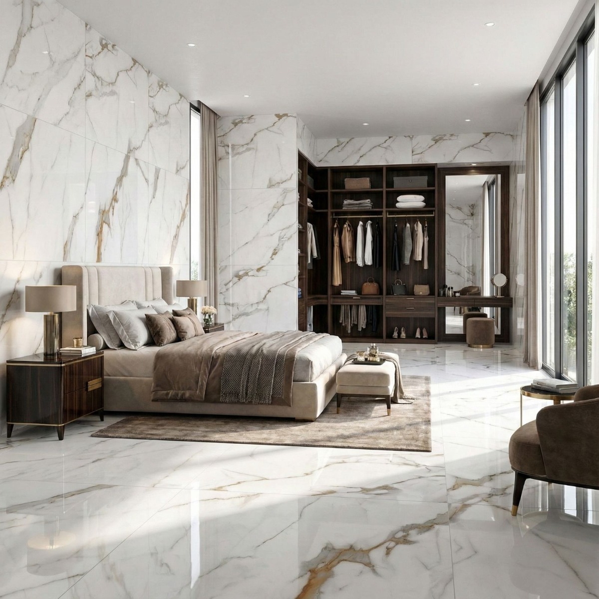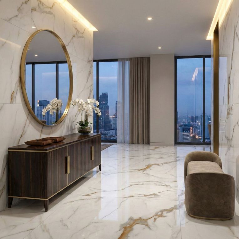 Pairing tip: Keep surrounding finishes soft and plain with warm neutrals, natural oak or gentle greys so the marble movement does the work.