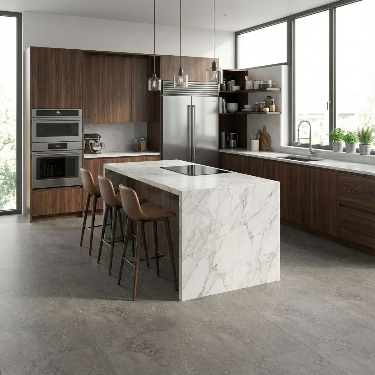 Pairing tip: Pair it with clean-lined joinery, warm timber tones and matte black or brushed metal details for an easy industrial-modern mix.