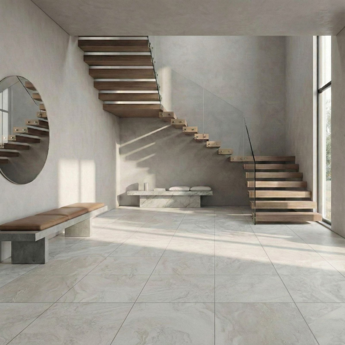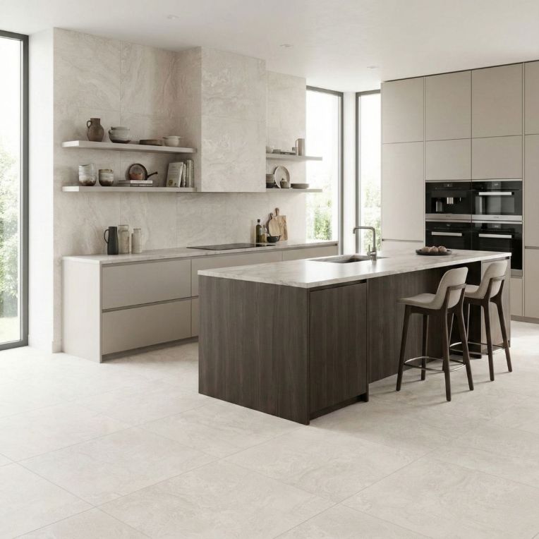 Mistic Light Grey Concrete Effect Carving Porcelain Wall and Floor Tile gives the carving porcelain wall and floor tile a calm architectural feel, borrowing the look of a concrete effect tile without making the room feel cold. The concrete effect treatment gives the smoky grey surface an urban, design-led feel that still reads warm enough for residential spaces. The porcelain body gives it the kind of dense, easy-care surface that works well in everyday spaces. The carving finish adds a little more surface character without making upkeep feel complicated. Its 600x600mm proportions keep the layout balanced, which works well when you want clarity without the drama of an oversized slab. It is a strong fit for bathrooms, kitchens and connecting living spaces where using the same tile across walls and floors helps the scheme feel more unified.