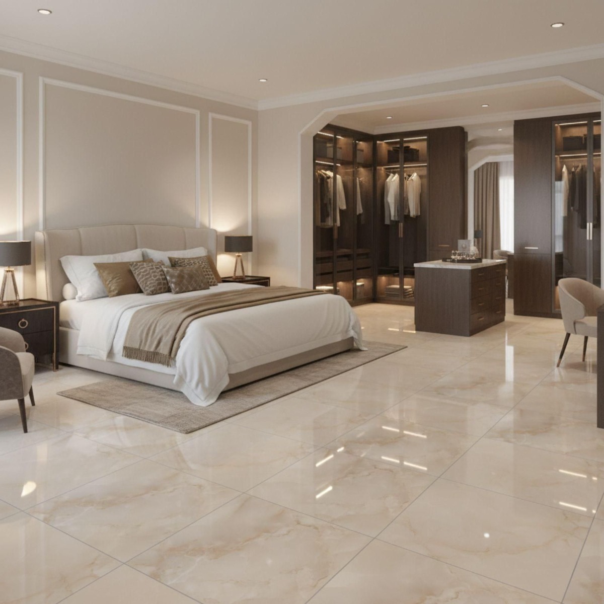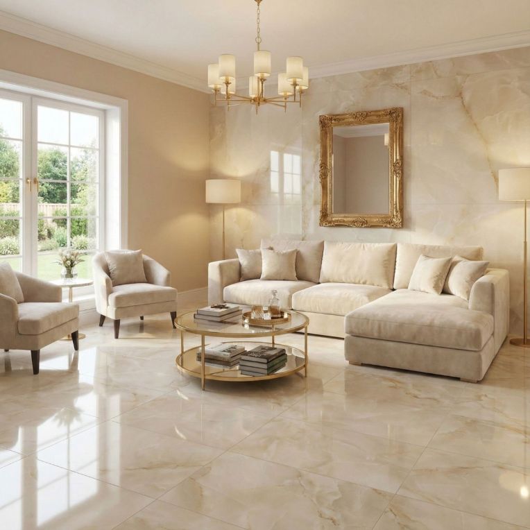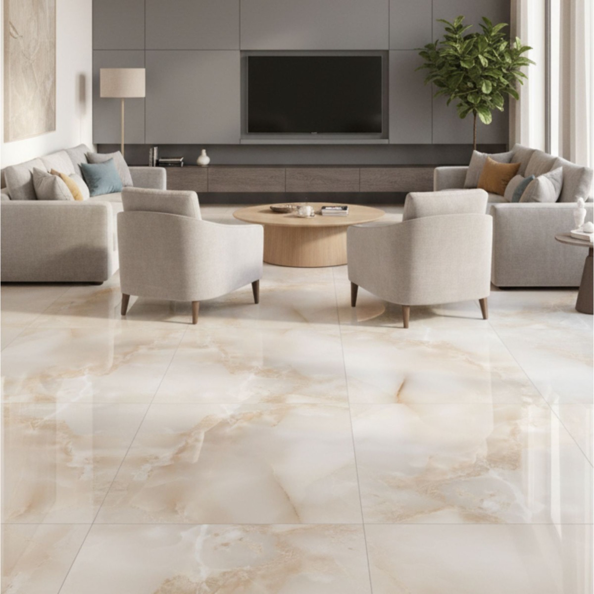 Mocha Beige Onyx Effect Rectified Gloss Porcelain Wall and Floor Tile introduces the drama of an onyx effect tile in a way that still feels controlled and usable. The onyx-inspired movement runs through the light beige tones in a way that feels fluid and expressive, especially across larger expanses. As a porcelain tile it is built for regular use, so you get a finish that looks design-led without becoming awkward to maintain. Rectified edges also help the finished installation look cleaner and more precise. Its 600x600mm proportions keep the layout balanced, which works well when you want clarity without the drama of an oversized slab. Because it works on both walls and floors, it is easy to carry through bathrooms, kitchens and circulation spaces for a more joined-up interior.
