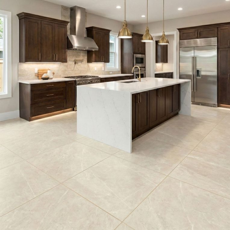 Montagna Tortilla Stone Cream Concrete Effect Rectified Matt Porcelain Wall and Floor Tile takes the everyday matt porcelain wall and floor tile and gives it the understated edge of a concrete effect tile. There is a stripped-back confidence to the cream concrete look, giving the room texture and depth without relying on strong pattern. Practicality is where it earns its keep: the porcelain construction is durable and straightforward to look after, which matters in hard-working rooms. Rectified edges also help the finished installation look cleaner and more precise. The broad square format makes the layout feel steadier and less busy than smaller modules often can. It makes sense in hard-working interiors where walls and floors need to speak the same design language, especially in bathrooms and kitchens.