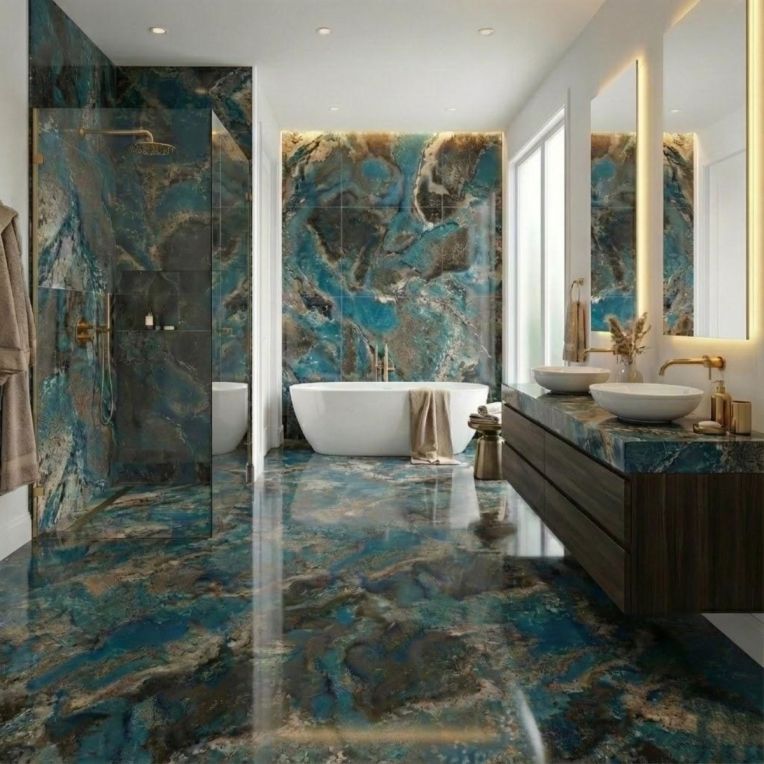 Octevia Aqua Blue Marble Effect Rectified High Gloss Porcelain Wall and Floor Tile is an easy way to bring in the look of a marble effect tile without tipping the room into something overly formal. The blue base and marble-style veining come alive under the high gloss finish, helping light move around the room and giving the surface a more polished feel. The benefit of choosing porcelain here is that the surface stays robust and low-fuss in daily life, rather than looking good only on day one. Rectified edges also help the finished installation look cleaner and more precise. The reflective finish is also useful where you want to bounce a bit more light around the room. Because it comes in 600x1200mm, the layout feels broader and calmer, which is especially useful when you want a more seamless finish. It makes sense in hard-working interiors where walls and floors need to speak the same design language, especially in bathrooms and kitchens.