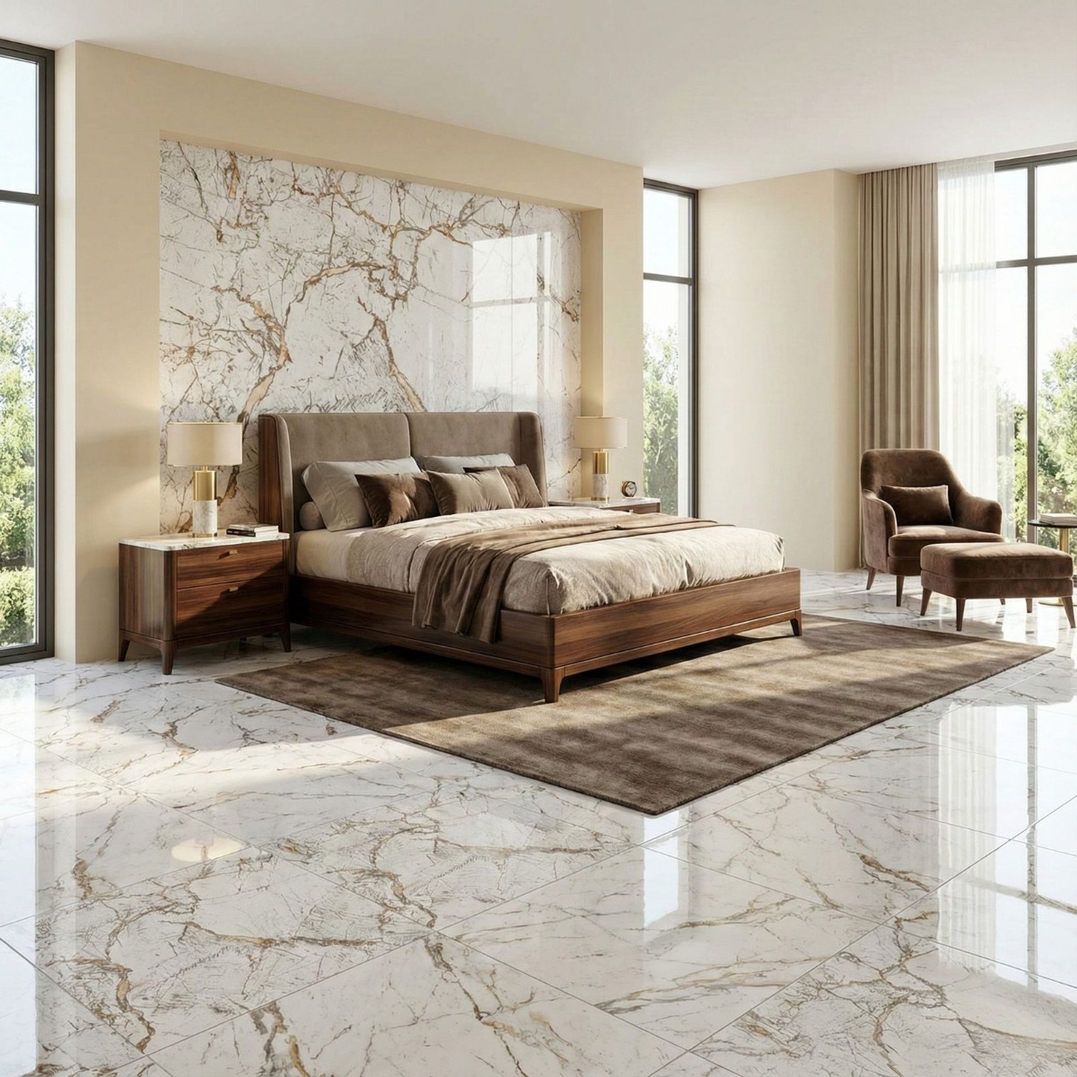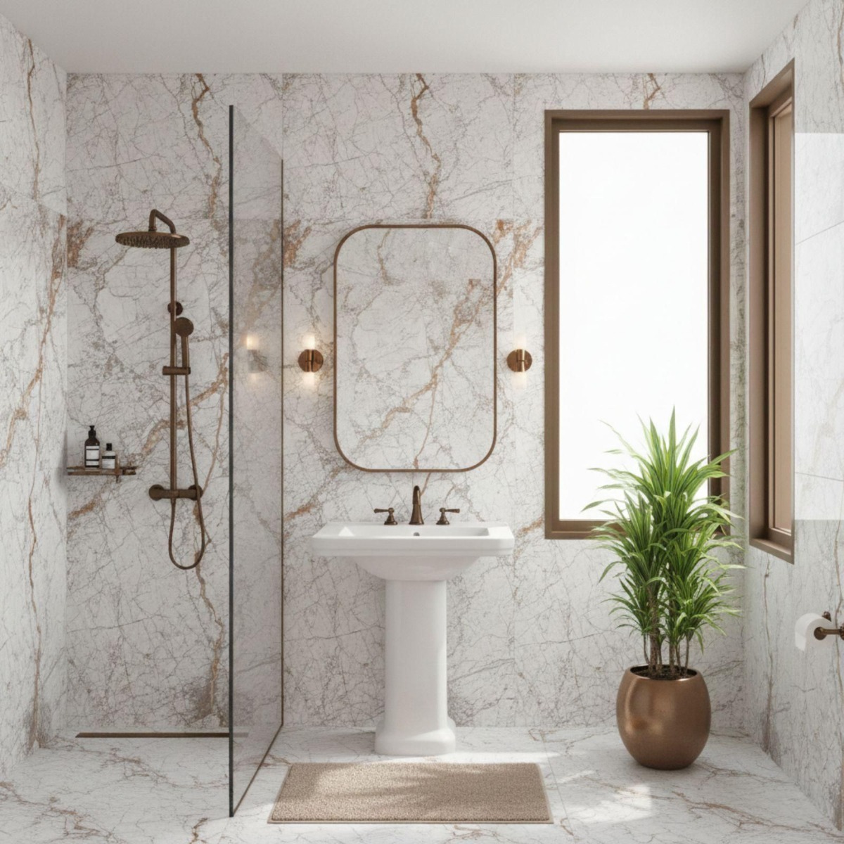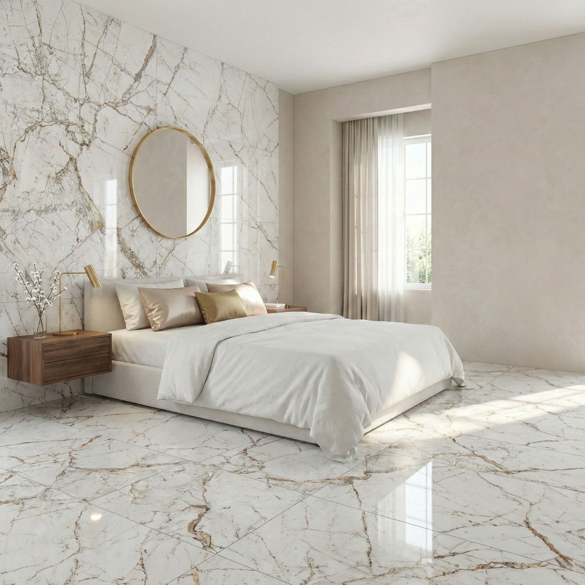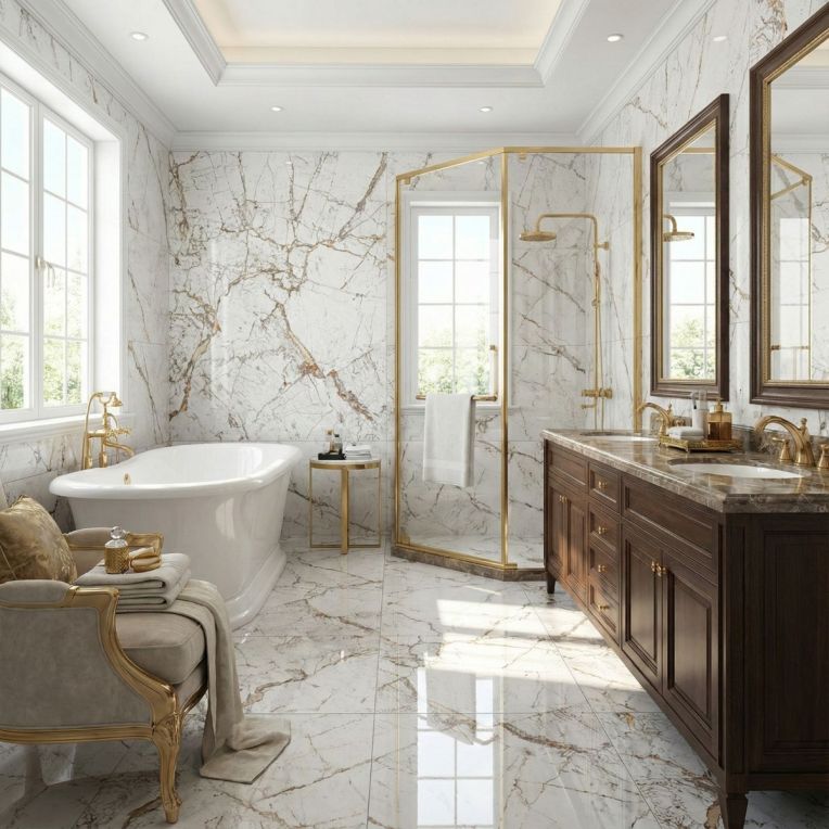 Pairing tip: Keep neighbouring tiles plain and neutral, and let simple décor and quieter finishes give the marble-style movement room to stand out.