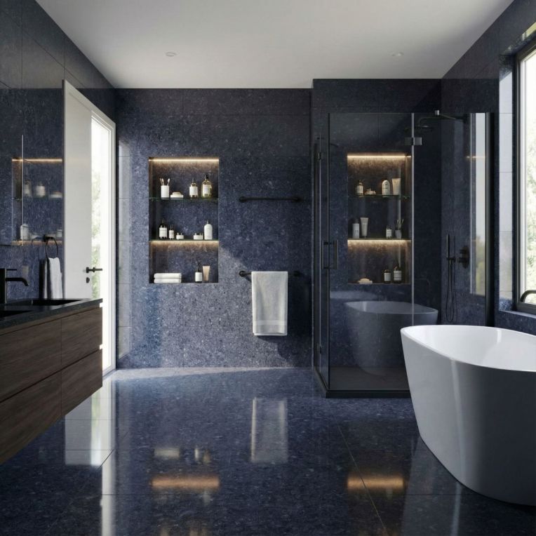 Pearl Modern Blue Concrete Effect Rectified Gloss Porcelain Wall and Floor Tile is a strong choice when you want the simplicity of a concrete effect tile with a cleaner, more finished appearance. The blue concrete effect is softened slightly by the reflective surface, so you get an industrial look with a brighter edge. Practicality is where it earns its keep: the porcelain construction is durable and straightforward to look after, which matters in hard-working rooms. Rectified edges also help the finished installation look cleaner and more precise. The 600x1200mm large format helps walls or floors read more cleanly, with fewer grout lines breaking up the surface. Because it works on both walls and floors, it is easy to carry through bathrooms, kitchens and circulation spaces for a more joined-up interior.