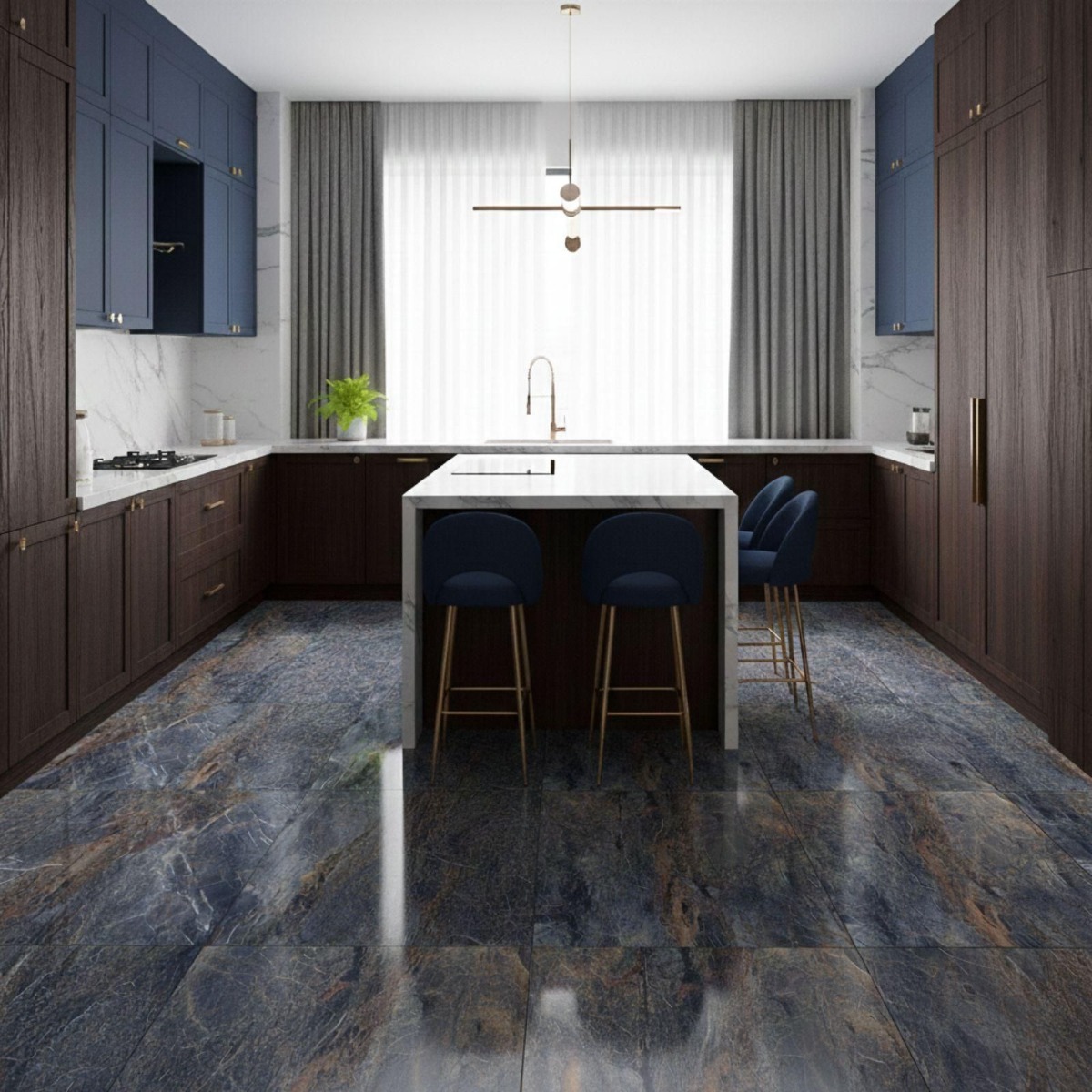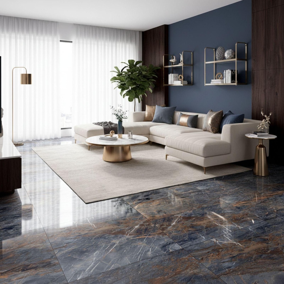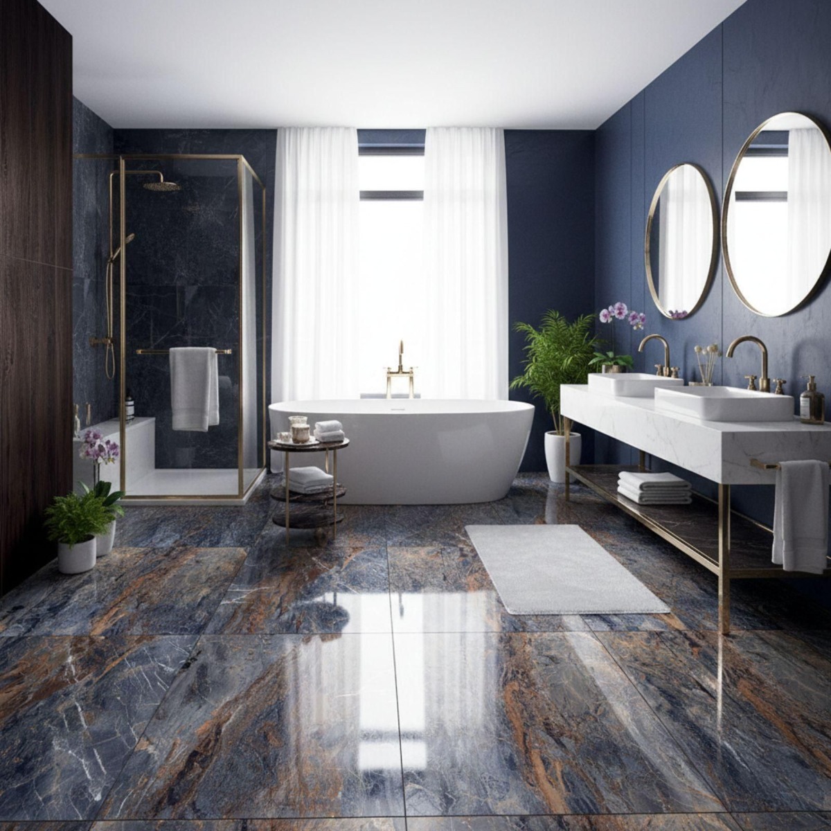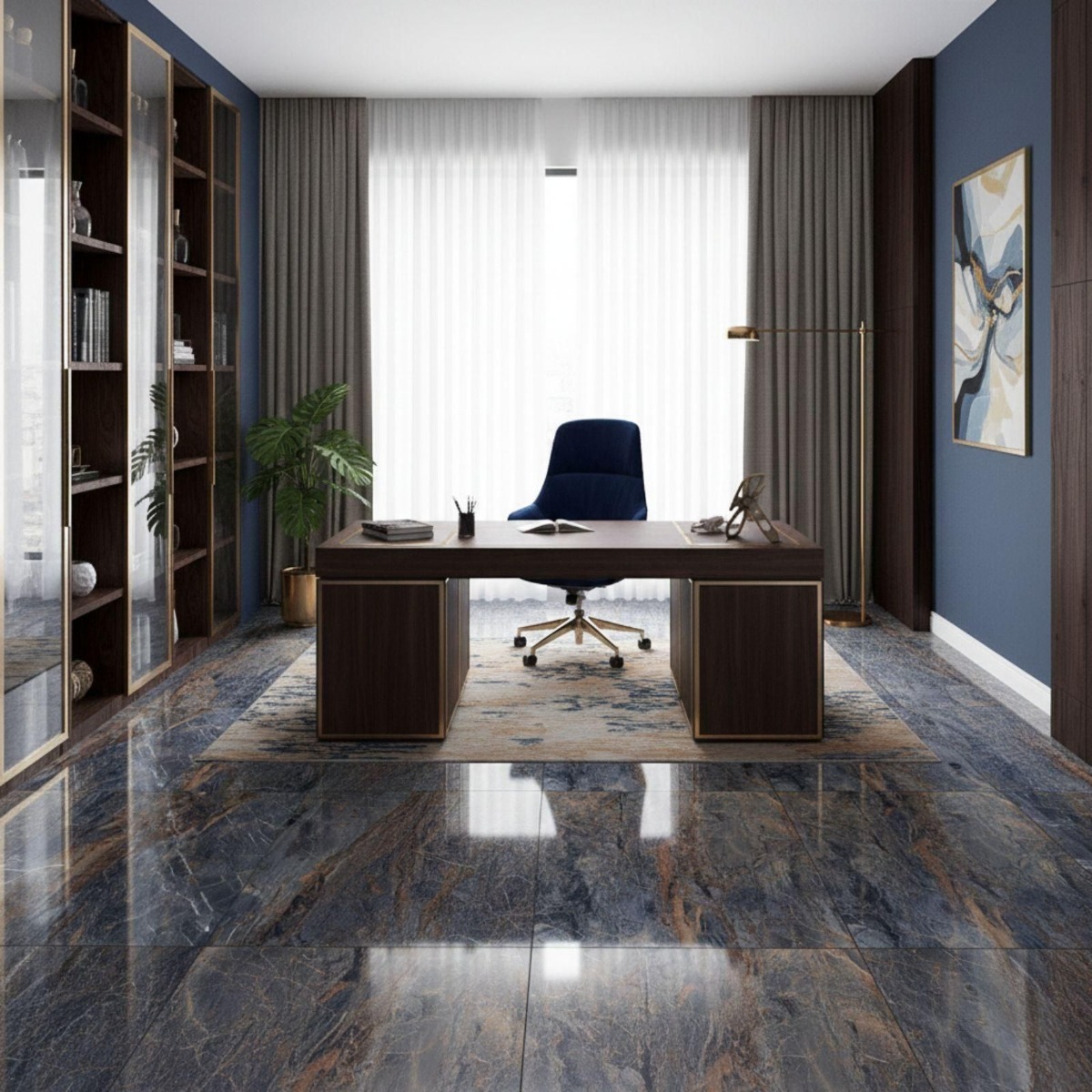 Ponzio Azul Rich And Copper Glossy Blue Marble Effect Rectified Gloss Porcelain Wall and Floor Tile pushes the gloss porcelain wall and floor tile in a more refined direction, with the appeal of a marble effect tile and less of the upkeep that natural stone can demand. The mix of muted blue shading and marble-inspired patterning gives the tile a premium feel, and the gloss finish stops it from looking one-dimensional. Practicality is where it earns its keep: the porcelain construction is durable and straightforward to look after, which matters in hard-working rooms. Rectified edges also help the finished installation look cleaner and more precise. The 600x600mm square format creates a tidy, even grid that feels modern without becoming stark. Because it works on both walls and floors, it is easy to carry through bathrooms, kitchens and circulation spaces for a more joined-up interior.