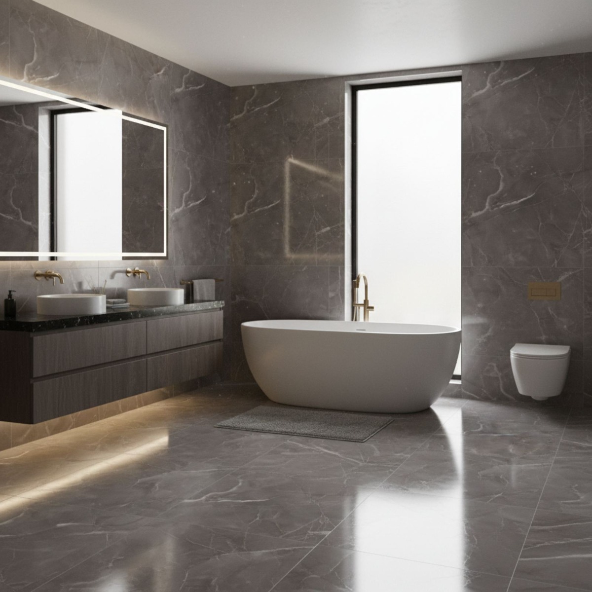 Prime Gris Grey Onyx Effect Rectified Gloss Porcelain Wall and Floor Tile brings a more statement-led mood to the gloss porcelain wall and floor tile, echoing the layered character of an onyx effect tile. The onyx-inspired movement runs through the mid-grey tones in a way that feels fluid and expressive, especially across larger expanses. Practicality is where it earns its keep: the porcelain construction is durable and straightforward to look after, which matters in hard-working rooms. Rectified edges also help the finished installation look cleaner and more precise. Because it comes in 600x1200mm, the layout feels broader and calmer, which is especially useful when you want a more seamless finish. Because it works on both walls and floors, it is easy to carry through bathrooms, kitchens and circulation spaces for a more joined-up interior.