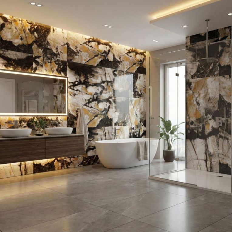 Pairing tip: Use plain off-white or pale grey supporting tiles, a lighter grout, and restrained brass or matte black accents so the veining stays centre stage.