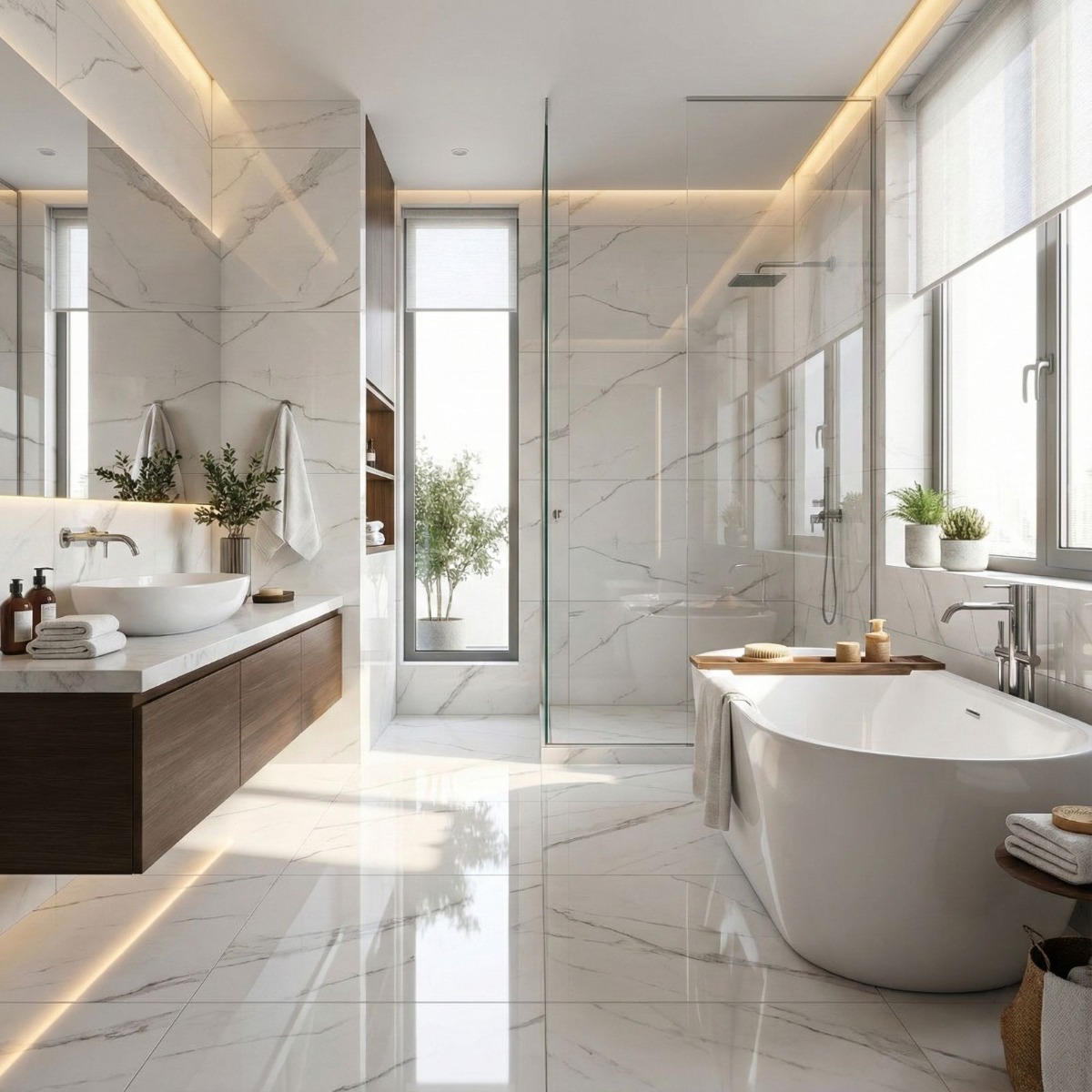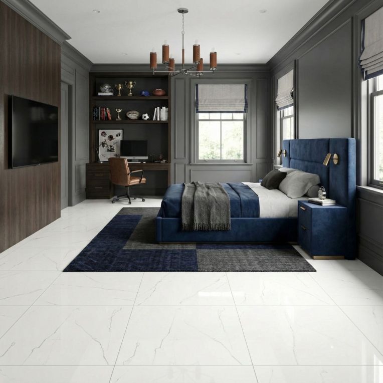Statario Origin White Marble Effect Rectified Gloss Porcelain Wall and Floor Tile offers the elegance of a marble effect tile in a finish that still feels practical to live with. You get the familiar depth of a marble effect tile here, with chalky white tones and subtle veining that make the surface feel layered and refined. Practicality is where it earns its keep: the porcelain construction is durable and straightforward to look after, which matters in hard-working rooms. Rectified edges also help the finished installation look cleaner and more precise. The 600x600mm square format creates a tidy, even grid that feels modern without becoming stark. It is a strong fit for bathrooms, kitchens and connecting living spaces where using the same tile across walls and floors helps the scheme feel more unified.
