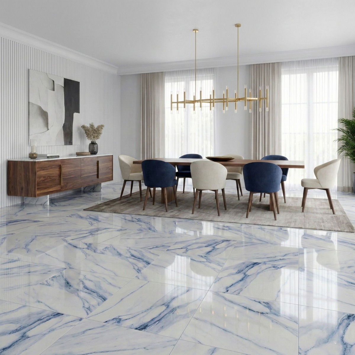 Statuario Mercury Blue White Marble Effect Rectified Gloss Porcelain Wall and Floor Tile gives the classic marble effect tile look a more polished, usable edge for everyday interiors. The mix of clean white shading and marble-inspired patterning gives the tile a premium feel, and the gloss finish stops it from looking one-dimensional. The porcelain body gives it the kind of dense, easy-care surface that works well in everyday spaces. Rectified edges also help the finished installation look cleaner and more precise. Its 600x600mm proportions keep the layout balanced, which works well when you want clarity without the drama of an oversized slab. Use it in bathrooms, kitchens or open-plan rooms when you want one surface to tie different zones together without losing visual interest.