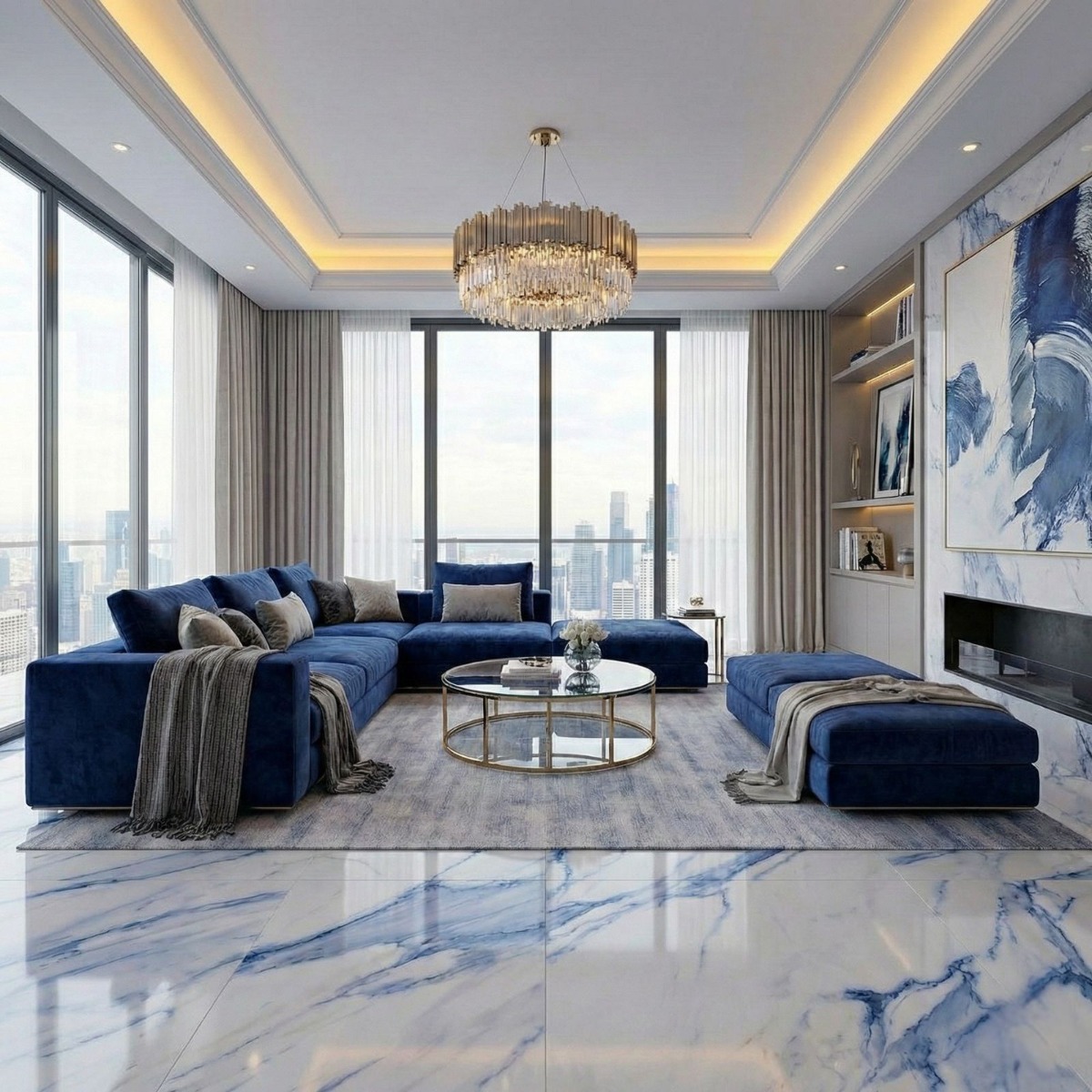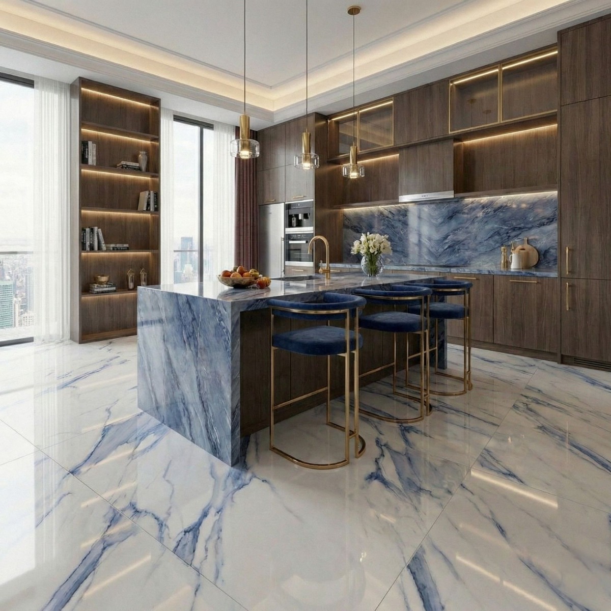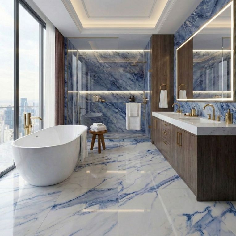 Statuario Mercury Blue White Marble Effect Rectified Large Gloss Porcelain Wall and Floor Tile