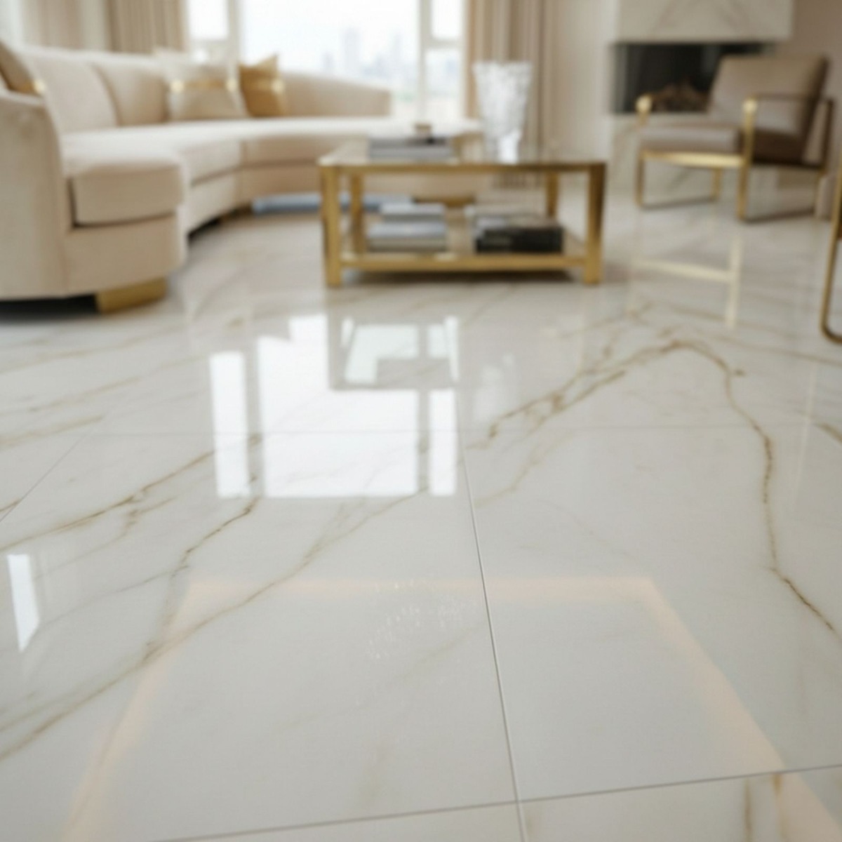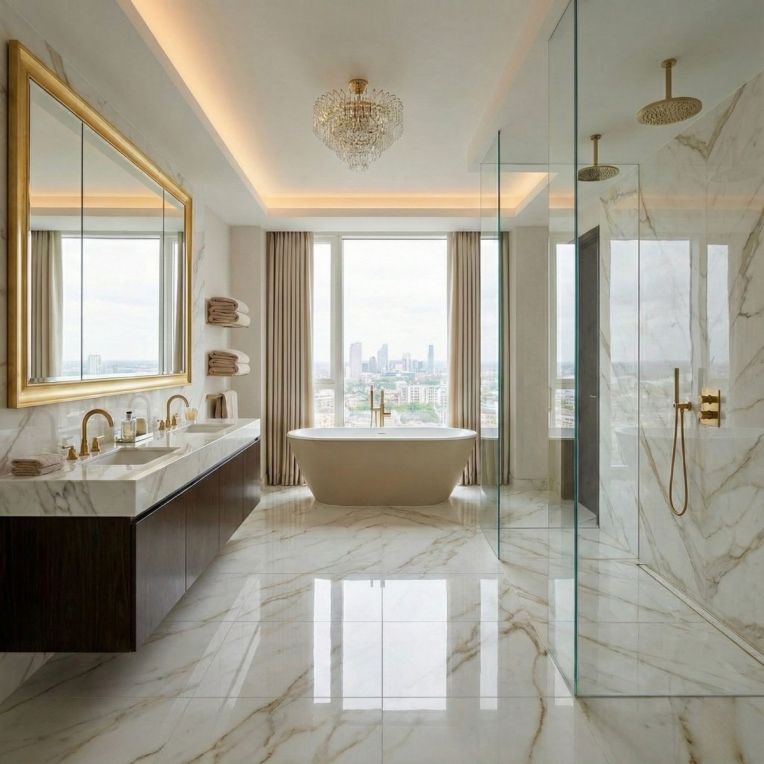 Statuario Mercury Gold White Marble Effect Rectified Gloss Porcelain Wall and Floor Tile is an easy way to bring in the look of a marble effect tile without tipping the room into something overly formal. The mix of clean white shading and marble-inspired patterning gives the tile a premium feel, and the gloss finish stops it from looking one-dimensional. The benefit of choosing porcelain here is that the surface stays robust and low-fuss in daily life, rather than looking good only on day one. Rectified edges also help the finished installation look cleaner and more precise. The square 600x600mm size sits comfortably in both compact and medium rooms, giving a neat finish that does not feel fussy. Because it works on both walls and floors, it is easy to carry through bathrooms, kitchens and circulation spaces for a more joined-up interior.