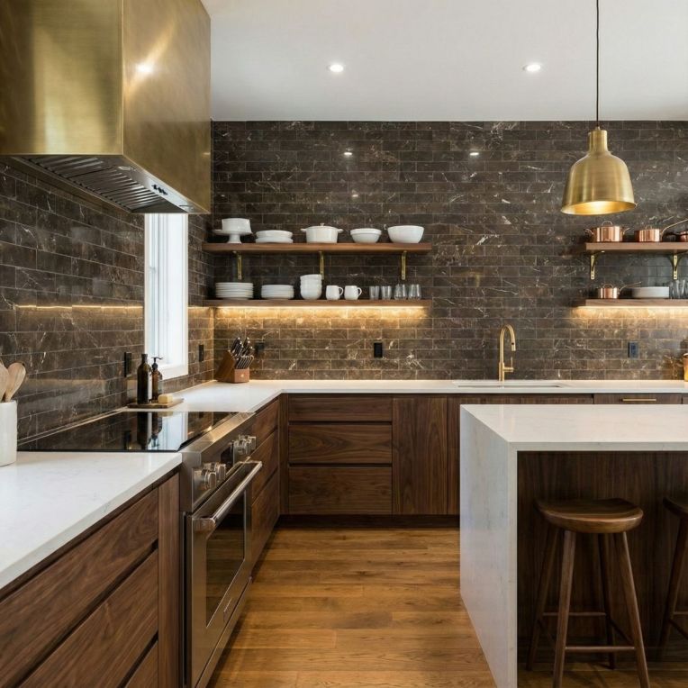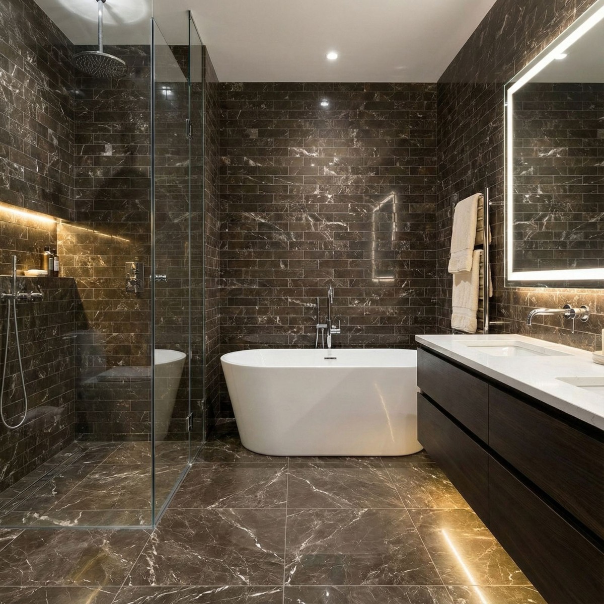 Pairing tip: Balance the darker marble look with soft white walls, light grout and a few warm metallic details so the finish still feels open.