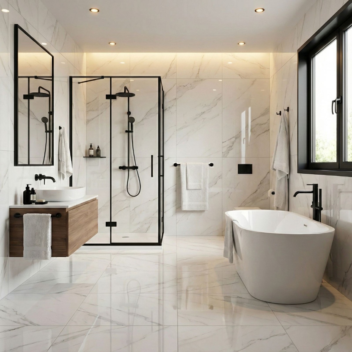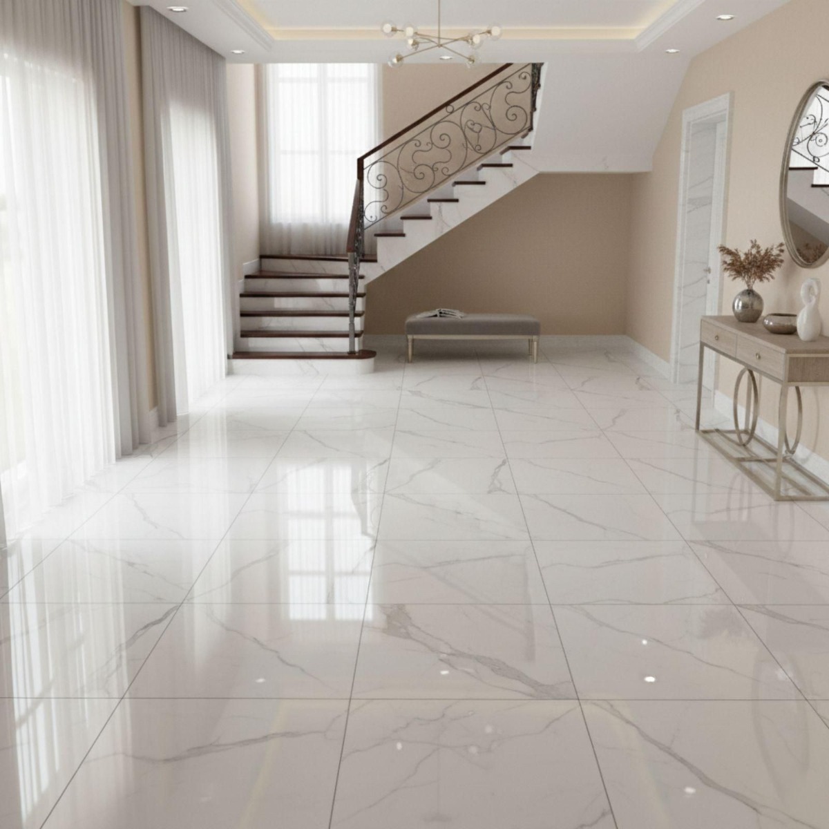 Thasos White Marble Effect Rectified Gloss Porcelain Wall and Floor Tile gives the classic marble effect tile look a more polished, usable edge for everyday interiors. The chalky white base and marble-style veining come alive under the gloss finish, helping light move around the room and giving the surface a more polished feel. The benefit of choosing porcelain here is that the surface stays robust and low-fuss in daily life, rather than looking good only on day one. Rectified edges also help the finished installation look cleaner and more precise. Its 600x600mm proportions keep the layout balanced, which works well when you want clarity without the drama of an oversized slab. It is a strong fit for bathrooms, kitchens and connecting living spaces where using the same tile across walls and floors helps the scheme feel more unified.