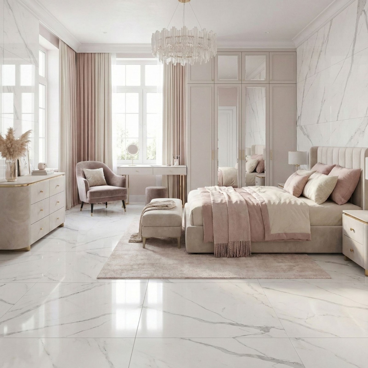 Pairing tip: Keep surrounding finishes soft and plain with warm neutrals, natural oak or gentle greys so the marble movement does the work.