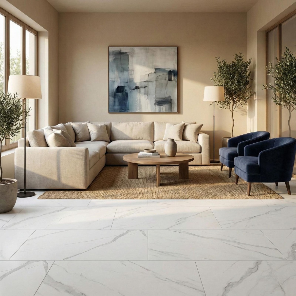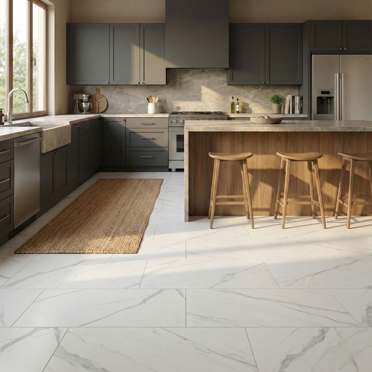 Thasos White Marble Effect Rectified Large Matt Porcelain Wall and Floor Tile gives the classic marble effect tile look a more polished, usable edge for everyday interiors. The white base and marble-style veining feel calmer through the matt finish, so the pattern reads naturally rather than looking overworked. The benefit of choosing porcelain here is that the surface stays robust and low-fuss in daily life, rather than looking good only on day one. Rectified edges also help the finished installation look cleaner and more precise. The matt surface keeps the overall result grounded and easier to style day to day. Because it comes in 600x1200mm, the layout feels broader and calmer, which is especially useful when you want a more seamless finish. It is a strong fit for bathrooms, kitchens and connecting living spaces where using the same tile across walls and floors helps the scheme feel more unified.