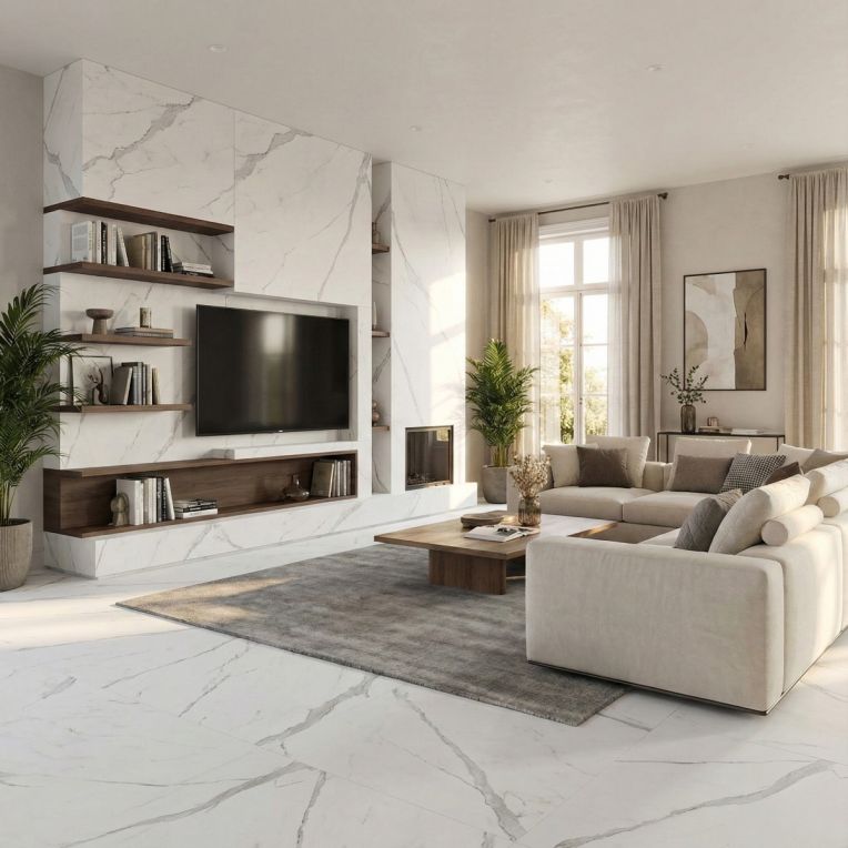 Pairing tip: Keep surrounding finishes soft and plain with warm neutrals, natural oak or gentle greys so the marble movement does the work.