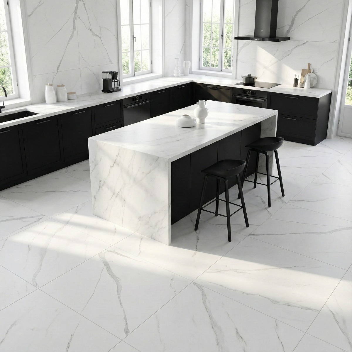 Thasos White Marble Effect Rectified Matt Porcelain Wall and Floor Tile gives the classic marble effect tile look a more polished, usable edge for everyday interiors. Its marble effect detailing adds natural-looking variation across the clean white background, and the matt finish shapes that movement in a way that feels polished rather than fussy. Practicality is where it earns its keep: the porcelain construction is durable and straightforward to look after, which matters in hard-working rooms. Rectified edges also help the finished installation look cleaner and more precise. The square 600x600mm size sits comfortably in both compact and medium rooms, giving a neat finish that does not feel fussy. Use it in bathrooms, kitchens or open-plan rooms when you want one surface to tie different zones together without losing visual interest.