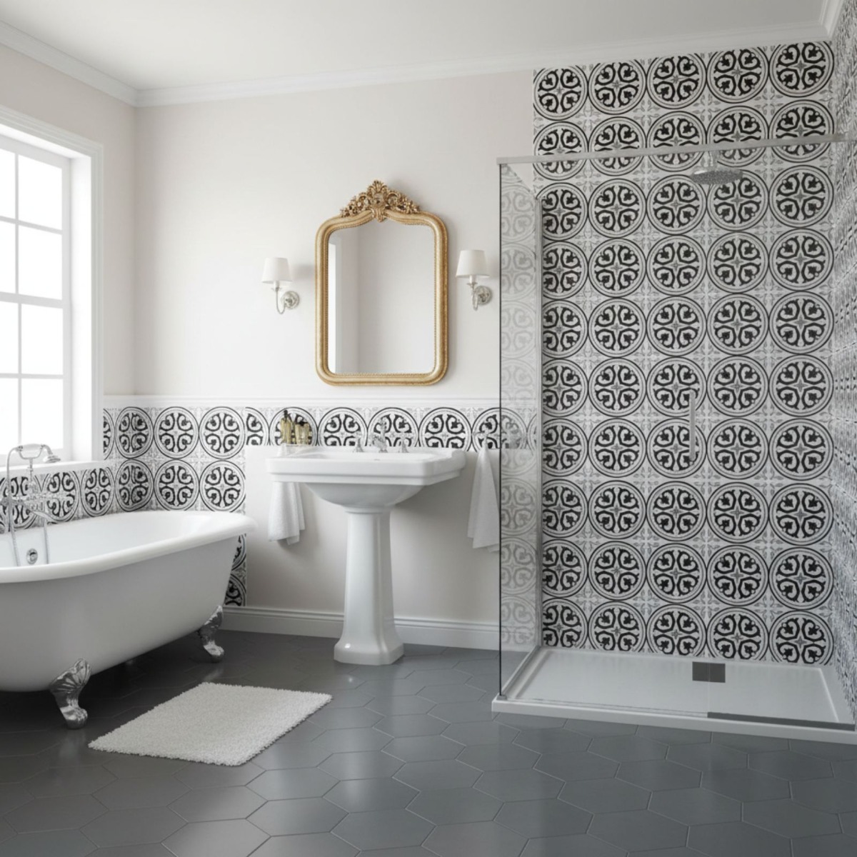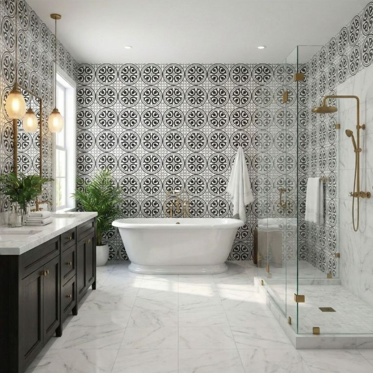 Pairing tip: Balance the pattern with plain white or light grey companions and keep the rest of the décor simple so the tile does not have to compete.